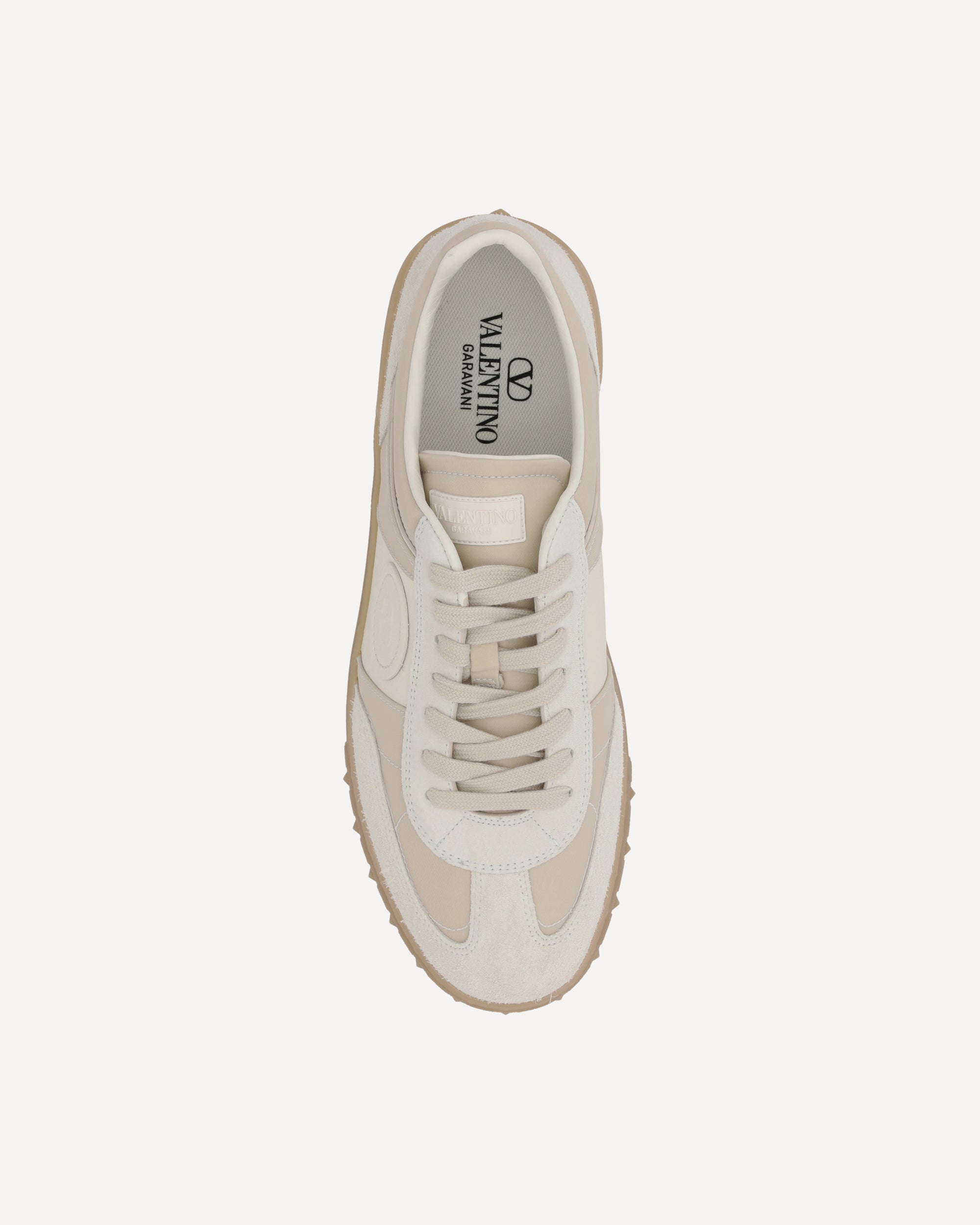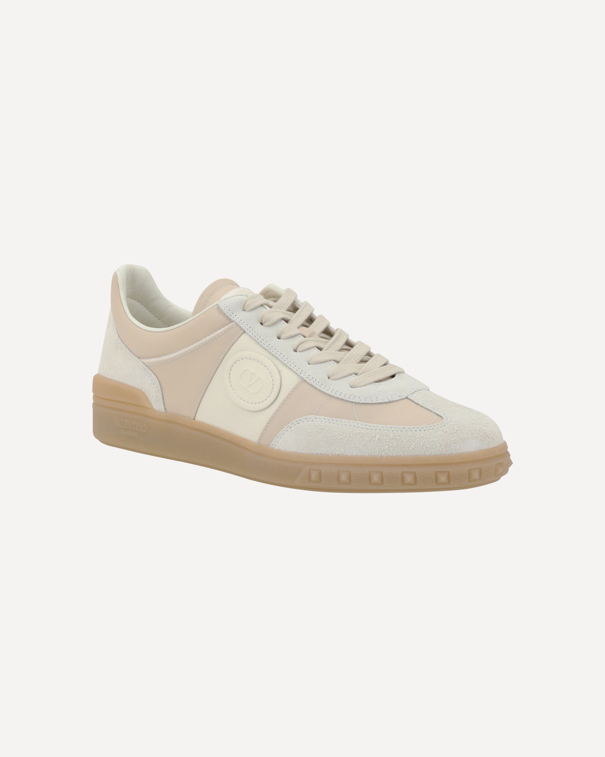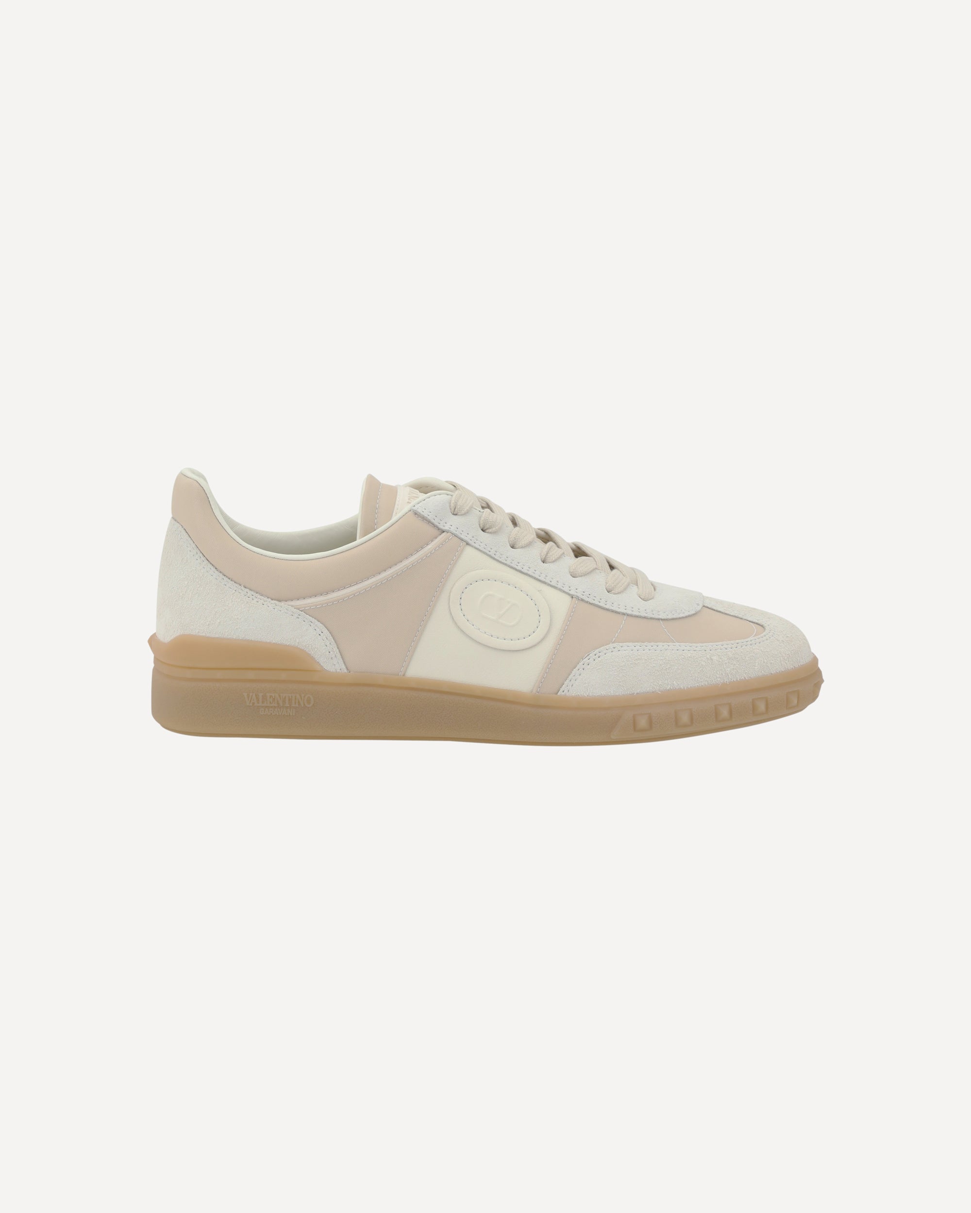 Valentino Garavani's Upvillage Sneakers are made of fine leather with suede details that enhance the design. They feature a round toe and a lace-up front closure for a comfortable and adjustable fit. A logo patch stands out on the outer side, adding a distinctive brand touch. The flat sole, decorated with the monogram and iconic studs, offers a bold and sophisticated look. The logoed insole also provides extra comfort. A model that combines elegance, style and practicality.