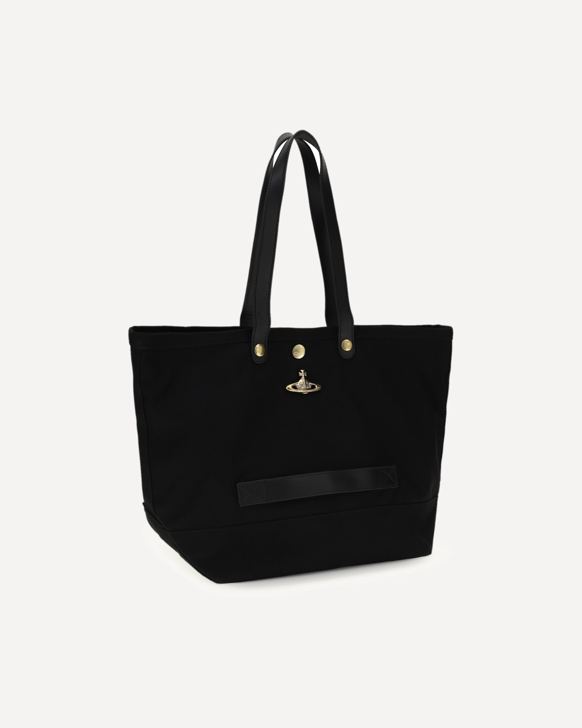 The Utility Tote Bag by Vivienne Westwood is a practical and distinctive accessory, ideal for everyday use. Featuring a handle and logo detail, it has a snap button closure that ensures security and functionality. The single strap and internal pocket complete the design, offering comfort and organization without compromising on the brand's iconic style. The details are in gold.