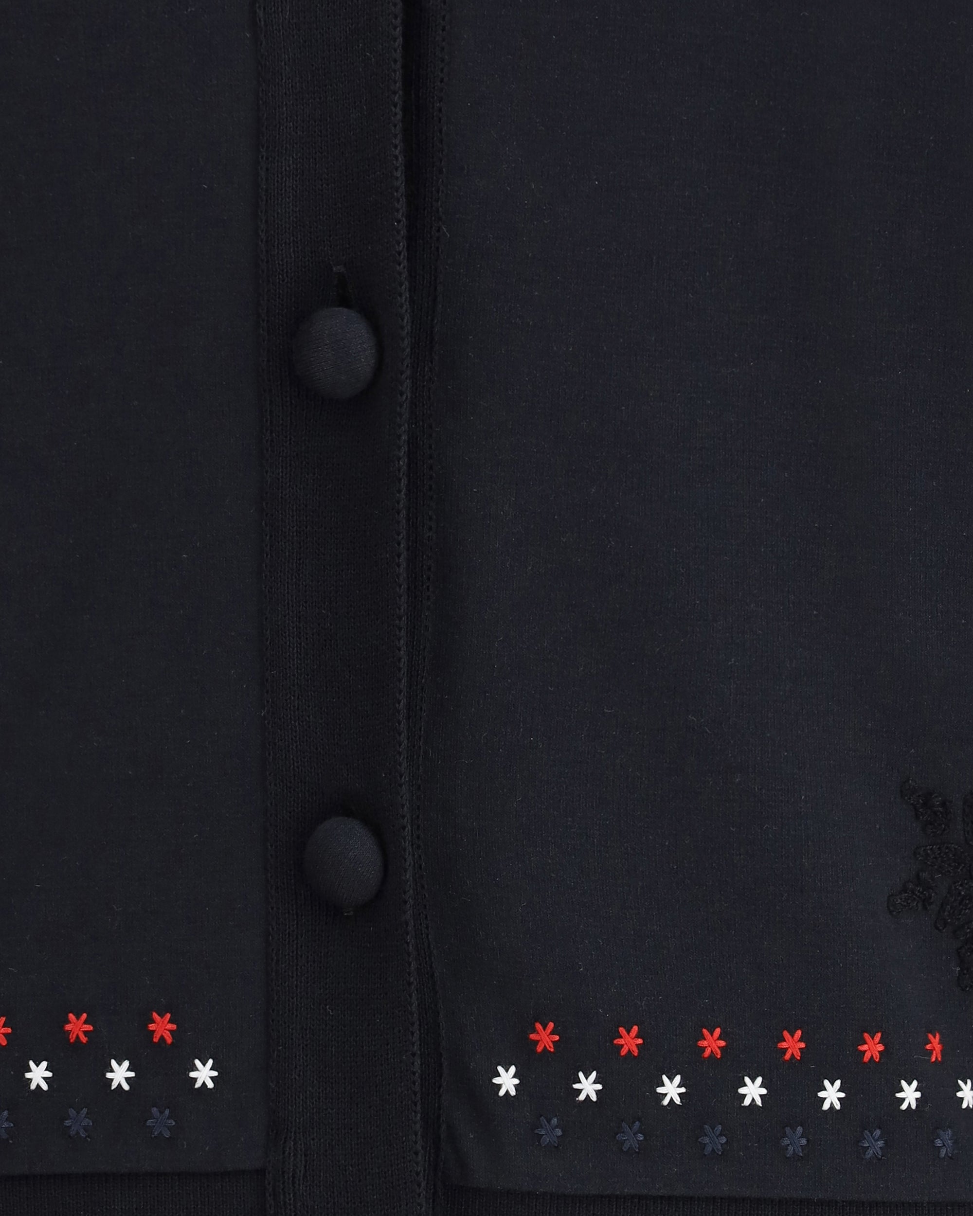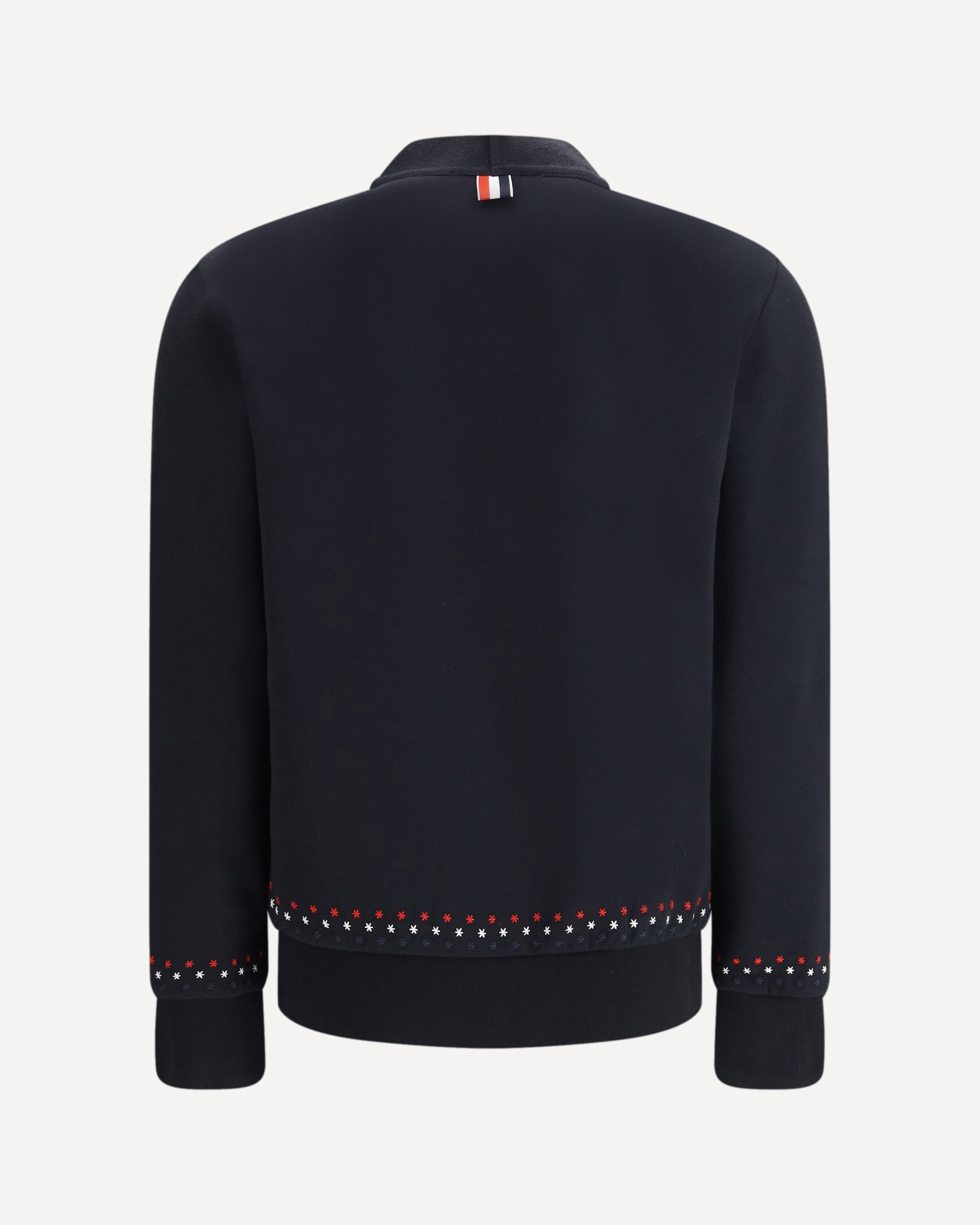 The Snowflakes Cardigan by Thom Browne combines elegance with distinctive details. Featuring a V-neckline, front button closure, and ribbed cuffs and hem, the design is embellished with snowflake-stitched sleeves and hem in the brand's three iconic colors. On the front, at the bottom right, small tone-on-tone snowflakes add a refined detail, making the cardigan a sophisticated and contemporary piece.