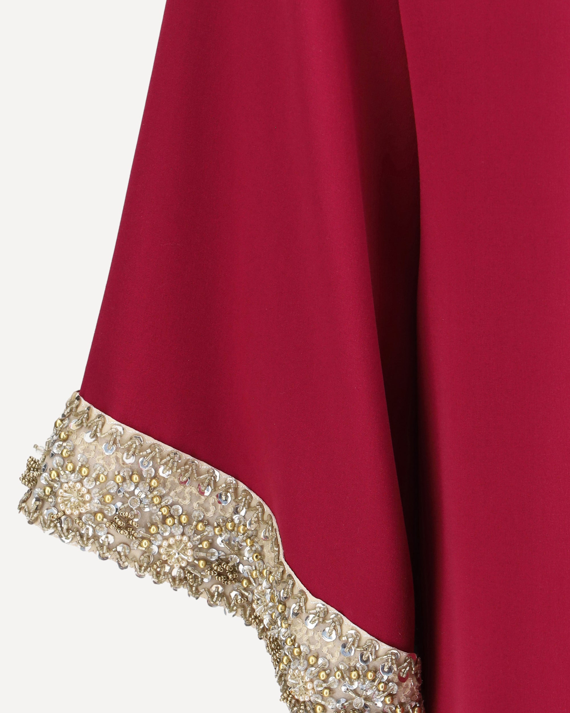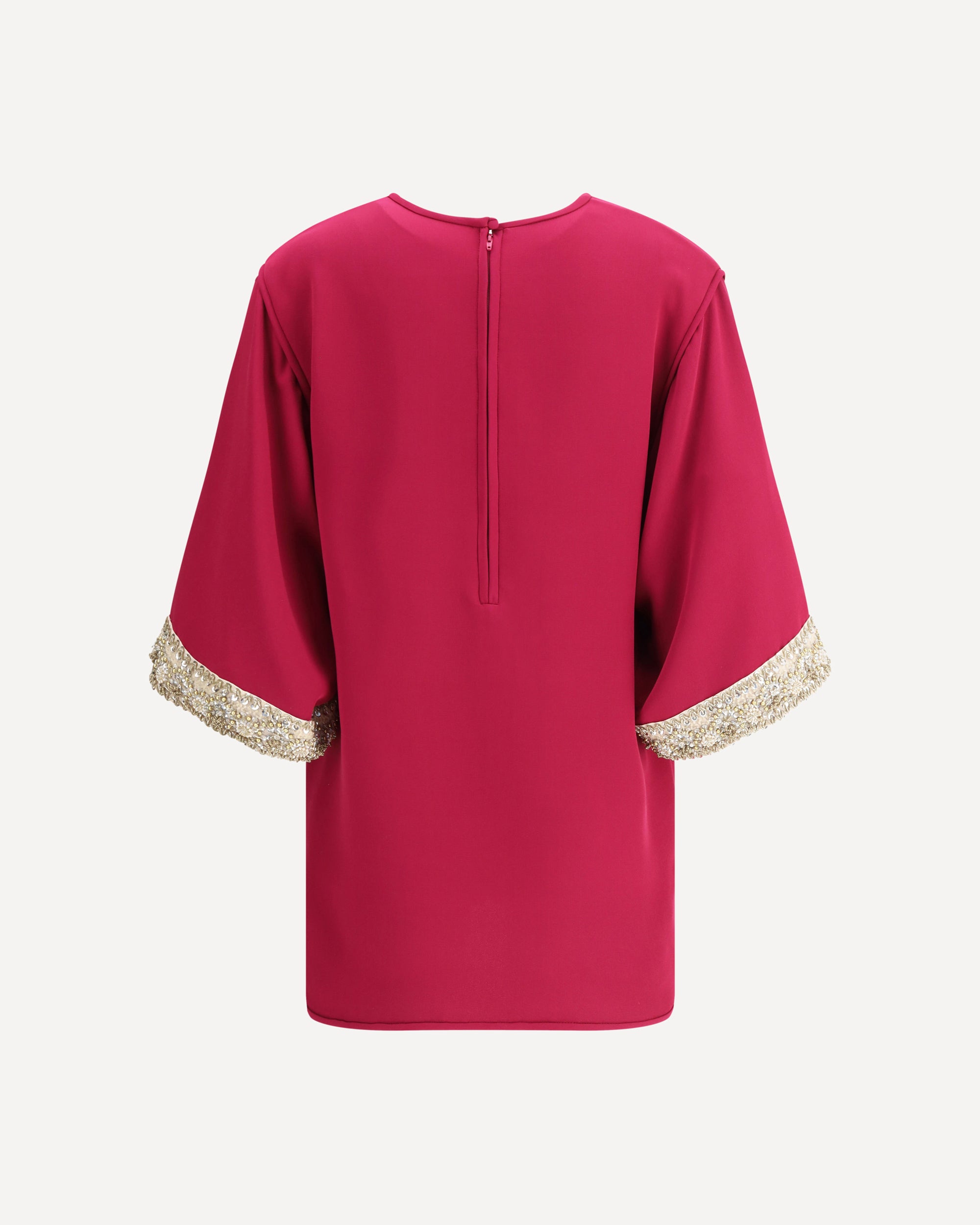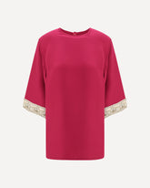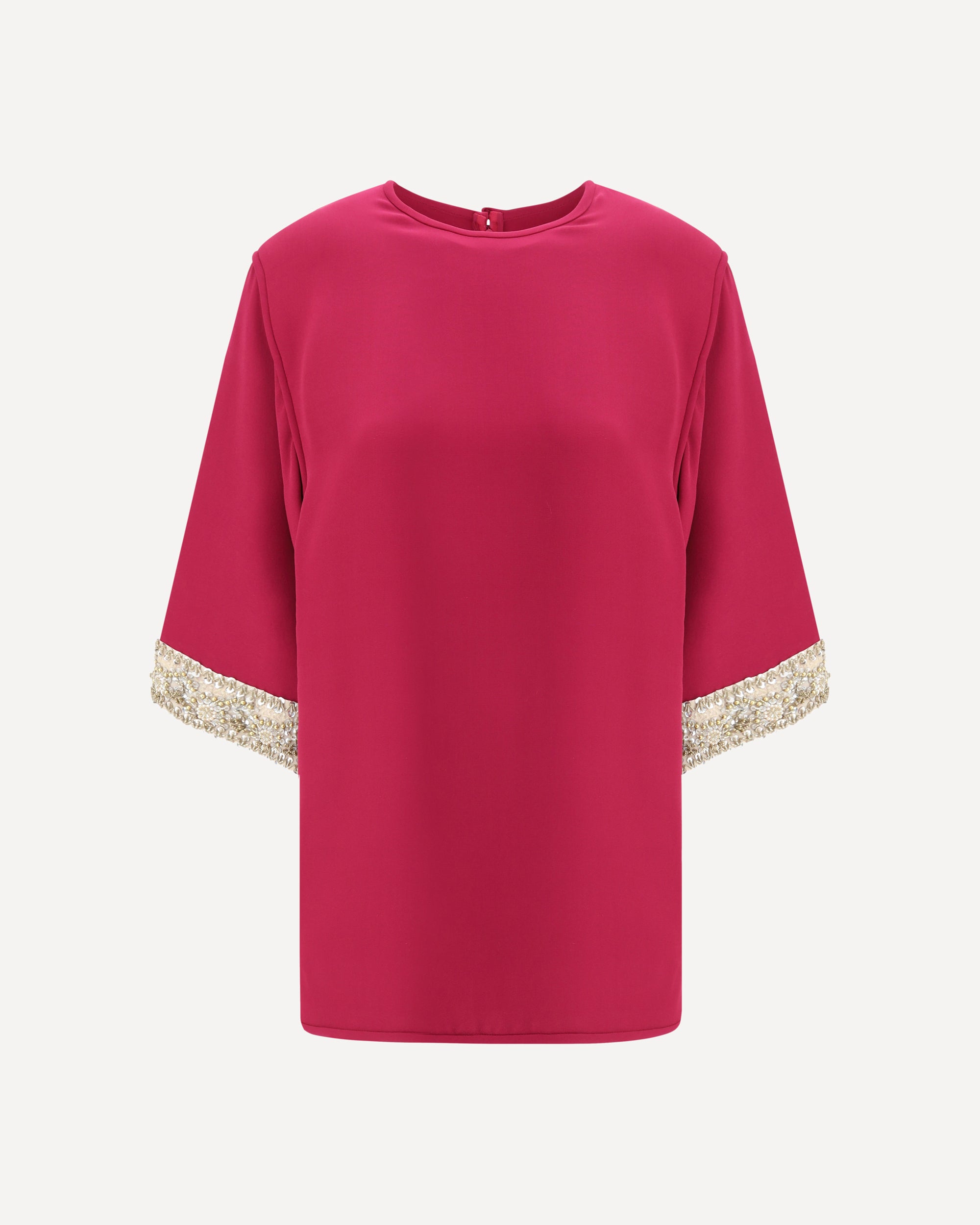 Valentino's Jewel Top features a classic crew neck that enhances its understated elegance. The back zipper closure defines its impeccable cut. The flared sleeves are embellished with pearl and bead embroidery on the hems, a refined detail that adds a touch of luxury and sophistication to the garment, making it perfect for special occasions or for those who want a chic and original look.