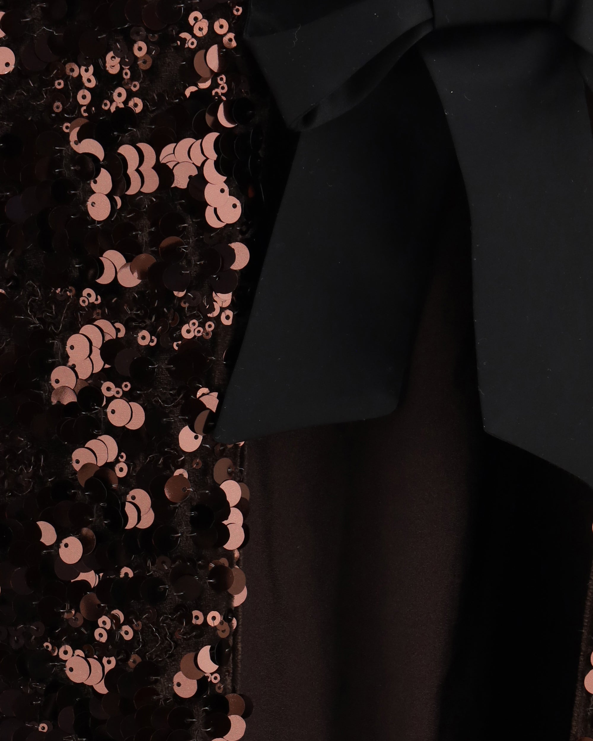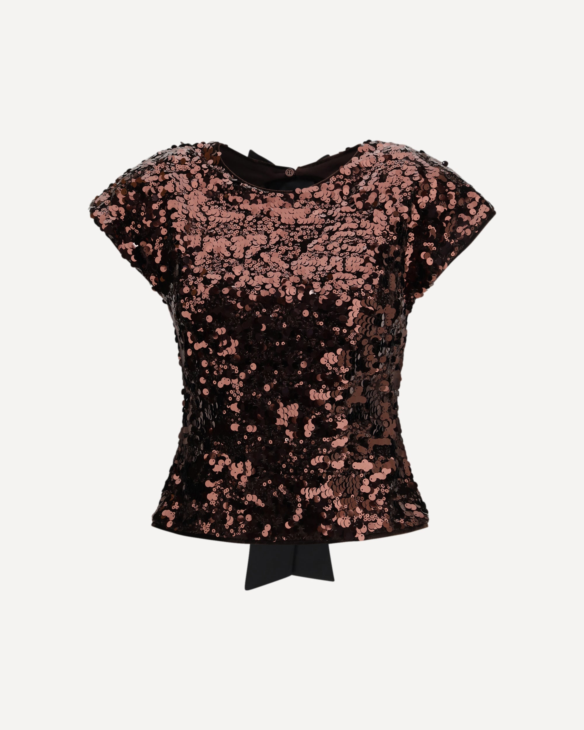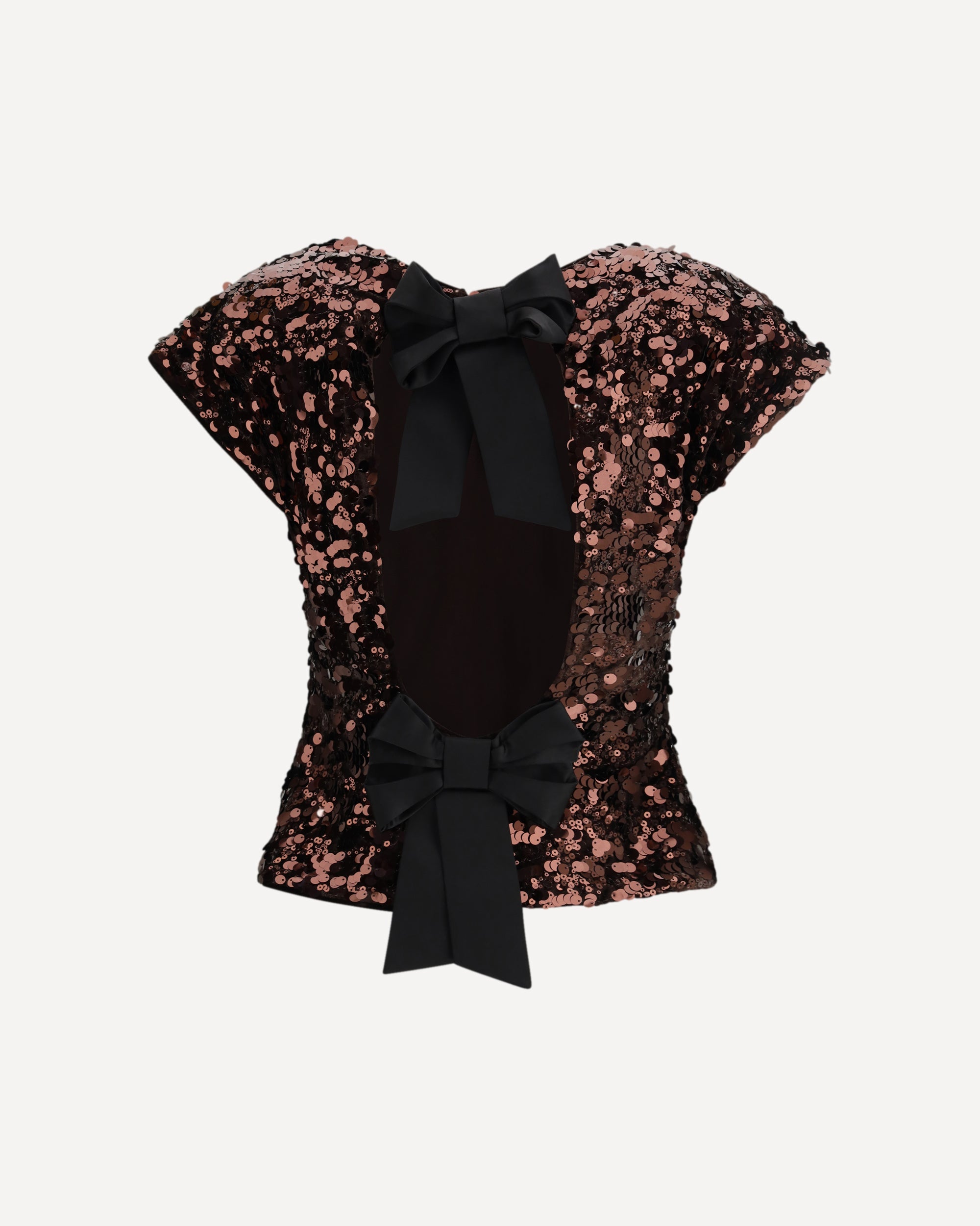 The sequins Top by GANNI embodies the brand’s playful and free-spirited attitude, reworking Scandinavian minimalism with a bold, contemporary twist. Fully embellished with shimmering sequins, it reflects the light with striking elegance. The open-back design reveals a sensual silhouette, enhanced by statement bow details that add a feminine yet ironic touch. A standout piece designed to shine, perfect for evening looks with a modern and unexpected allure.