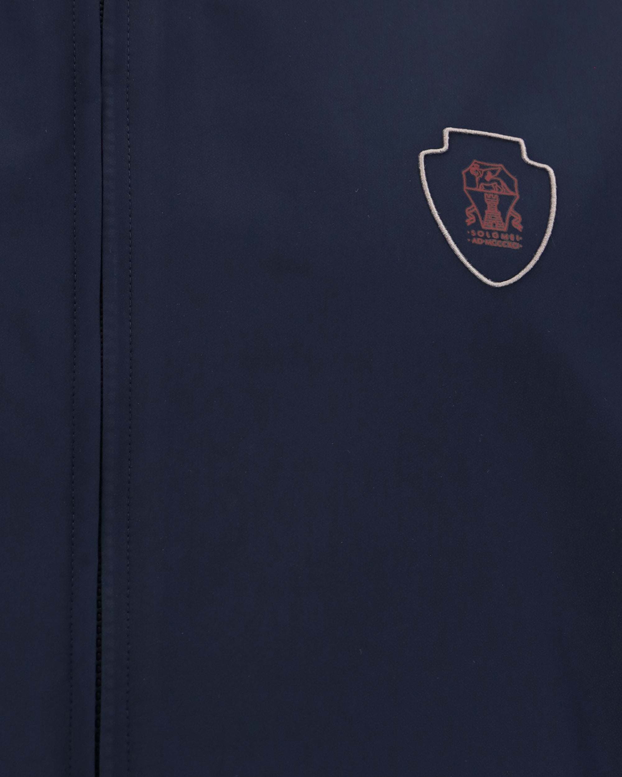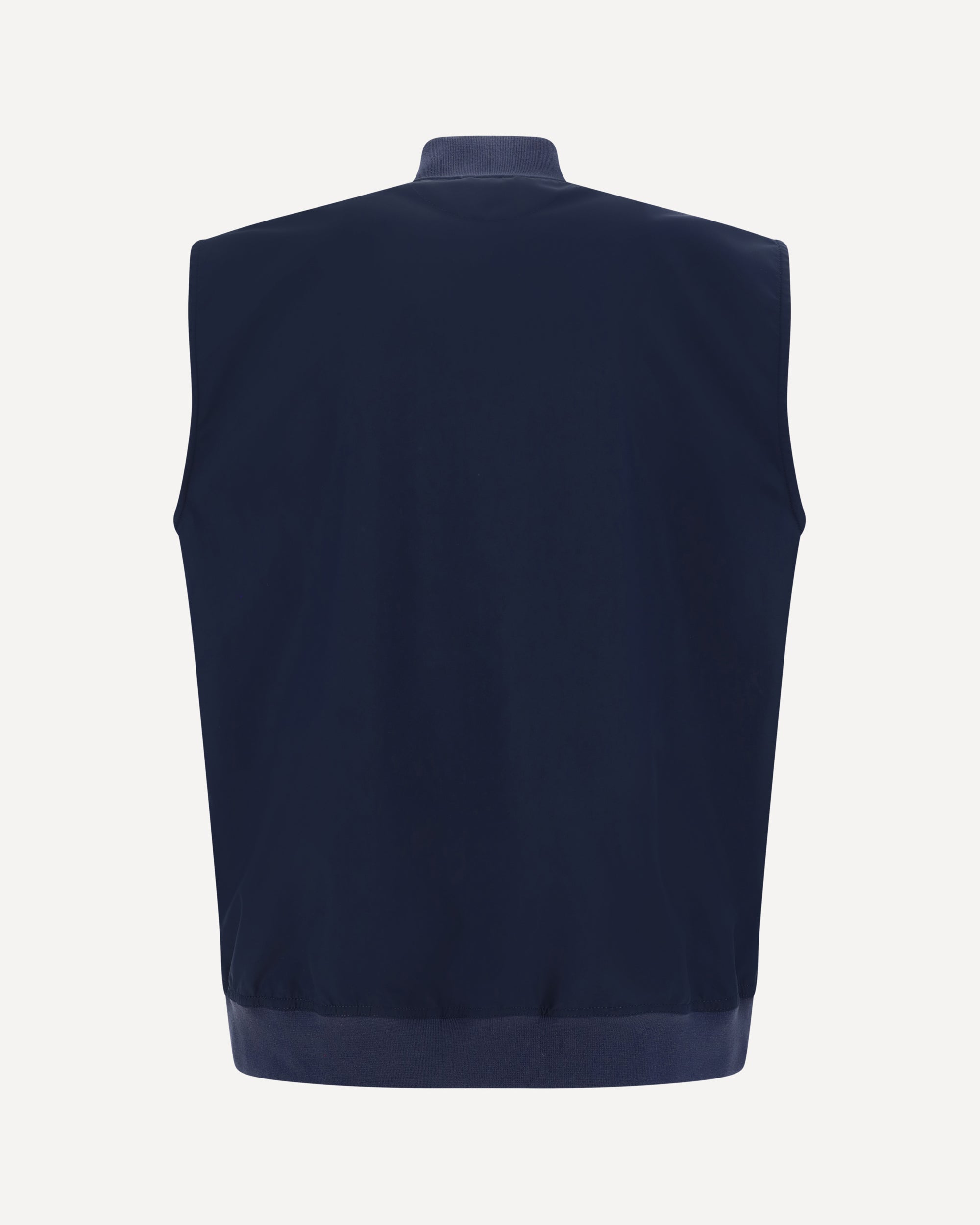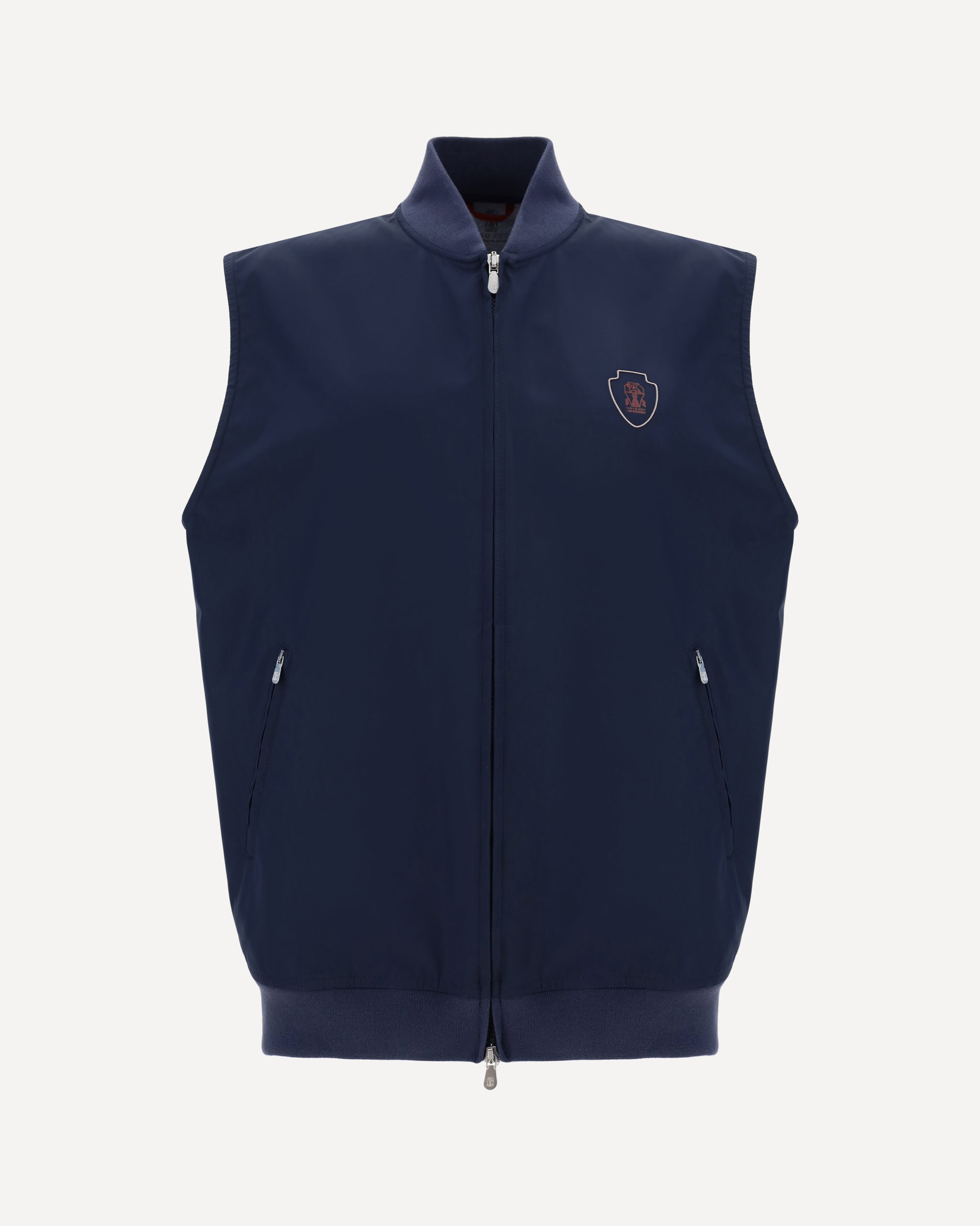 Vest by Brunello Cucinelli, ribbed high collar, front closure with double-slider zipper, two side welt pockets with zipper, ribbed hem, iconic brand monogram patch applied on front, monochrome pattern, regular fit.