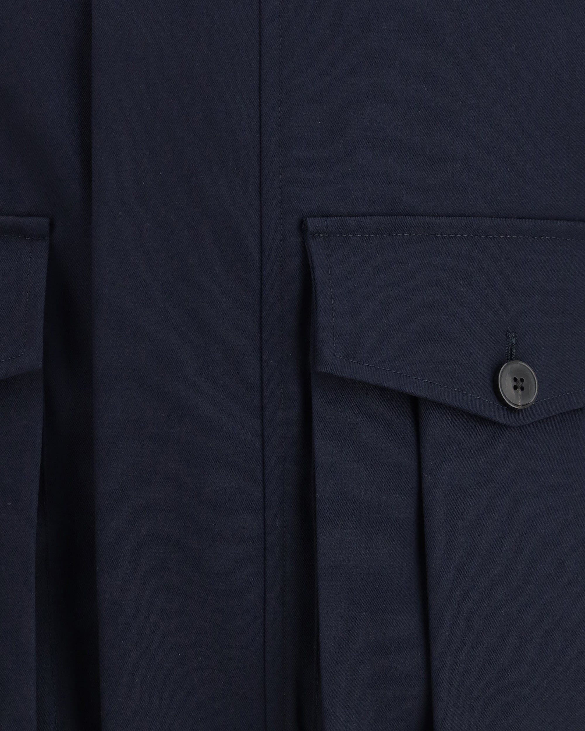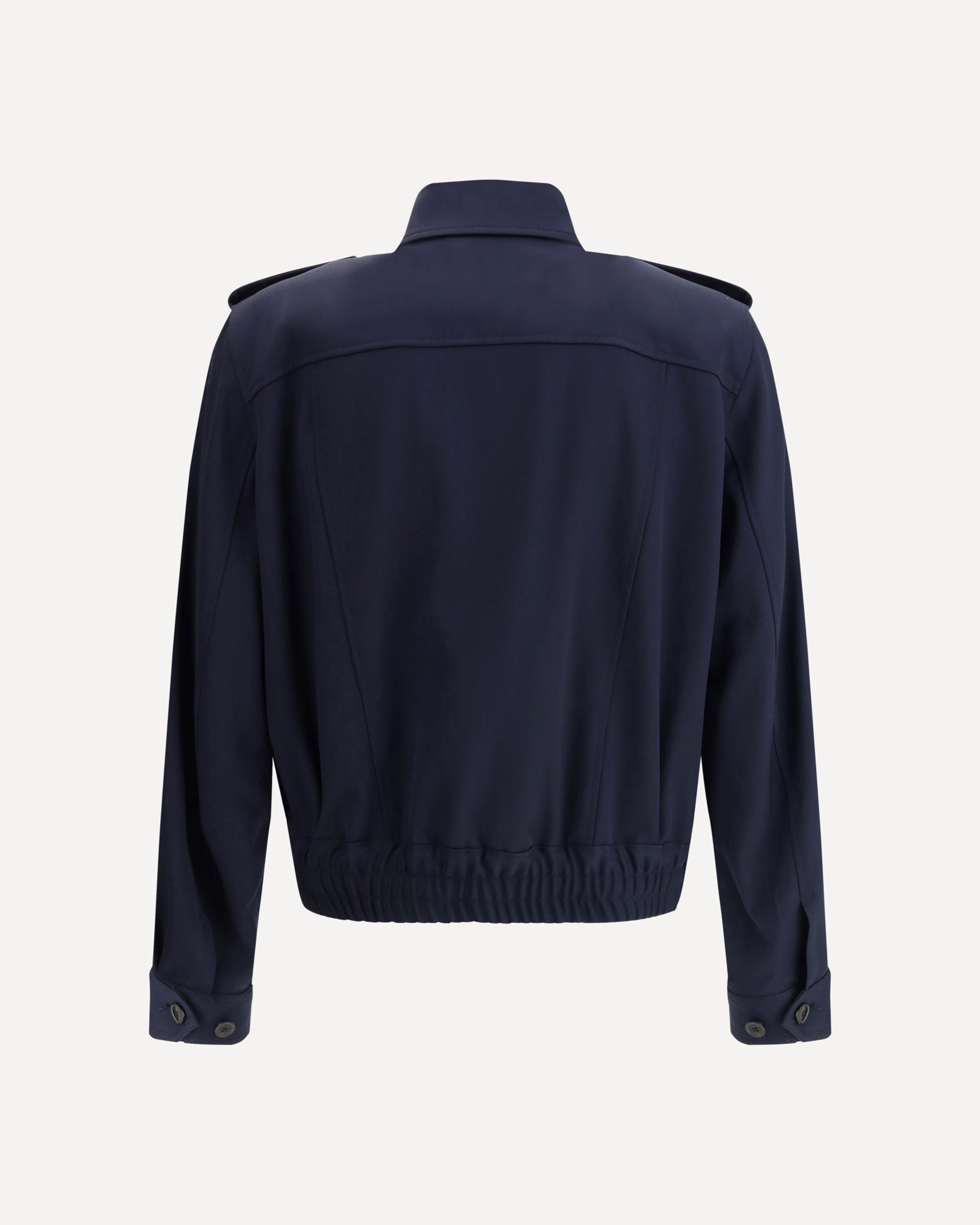 Dries Van Noten's vleo epaulet Jacket by Dries Van Noten features a classic collar and a front closure with snap buttons and a double-slider zipper, providing a secure and versatile fit. The elasticized hem adds a touch of comfort and practicality. On the front, there are two patch pockets with flaps and buttons, offering functionality and distinctive style. The overall design of the jacket with shoulder pads lends a modern, structured silhouette.