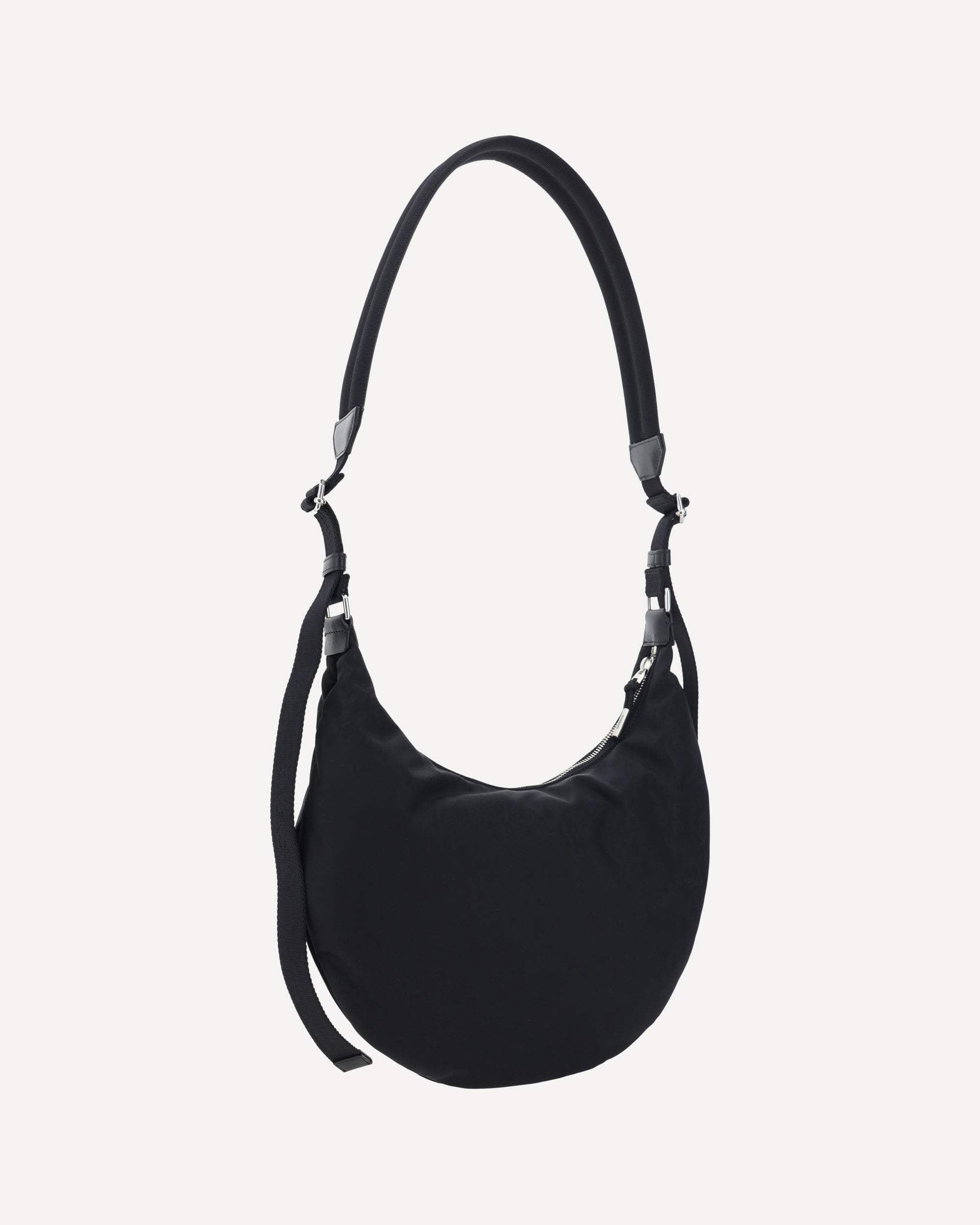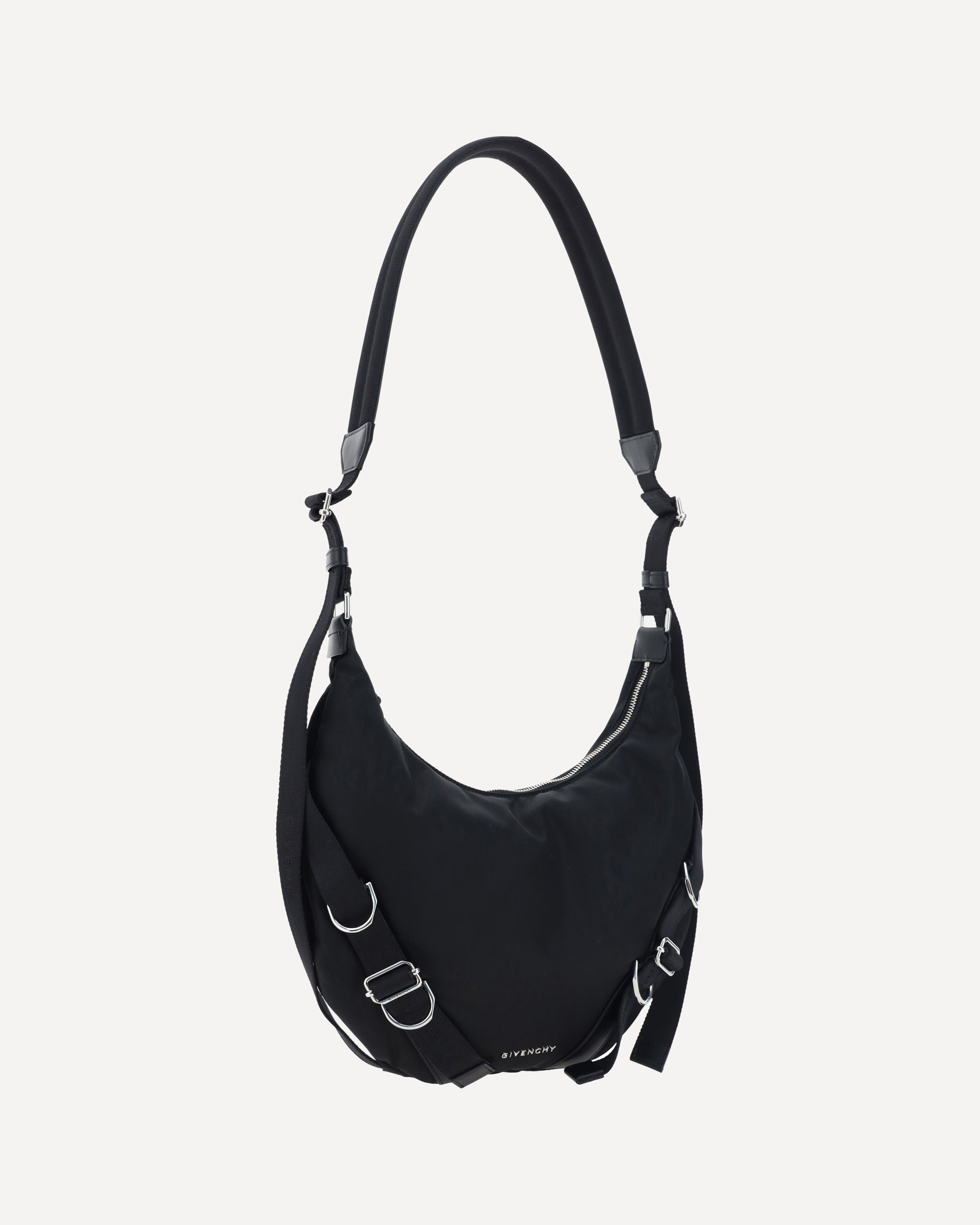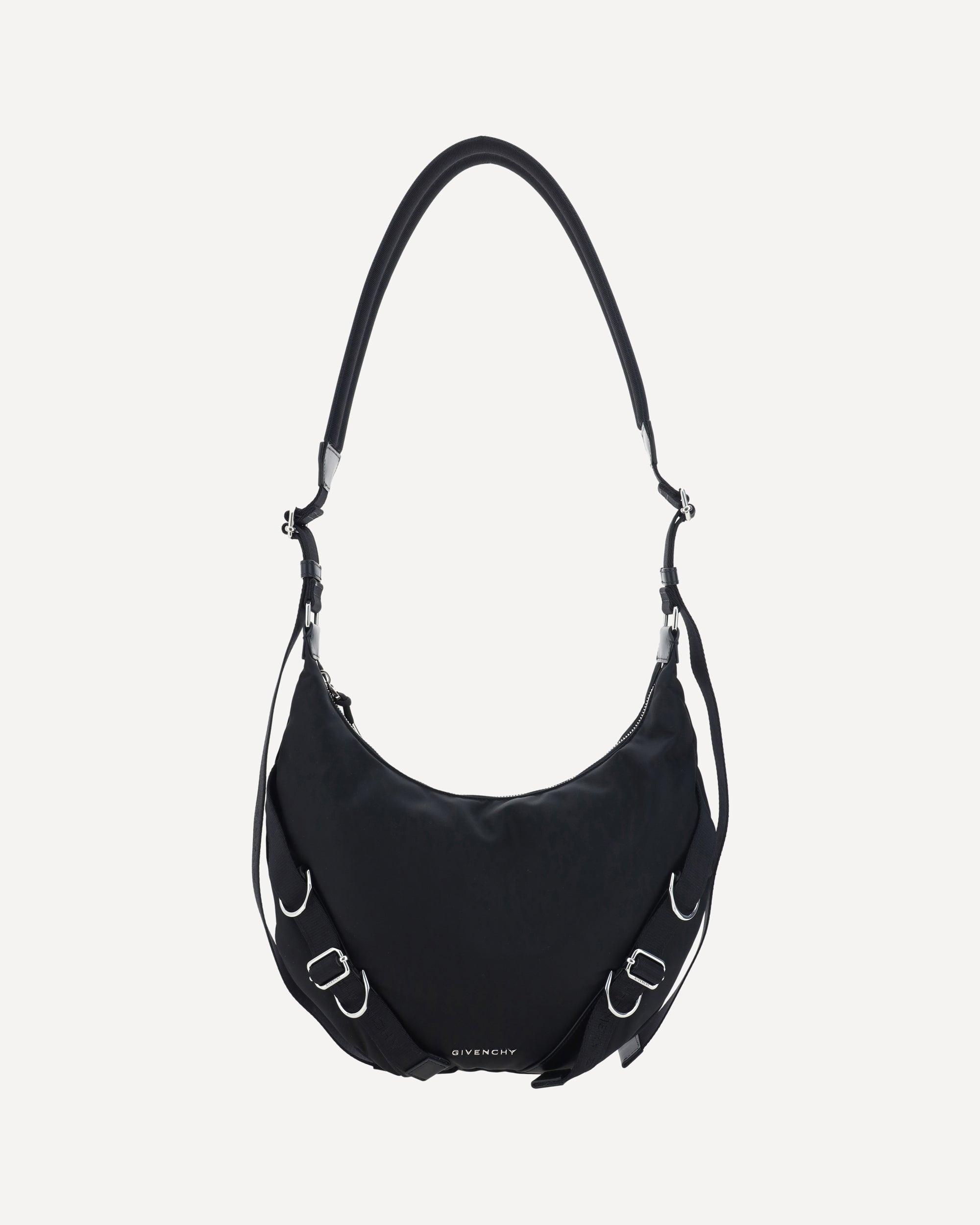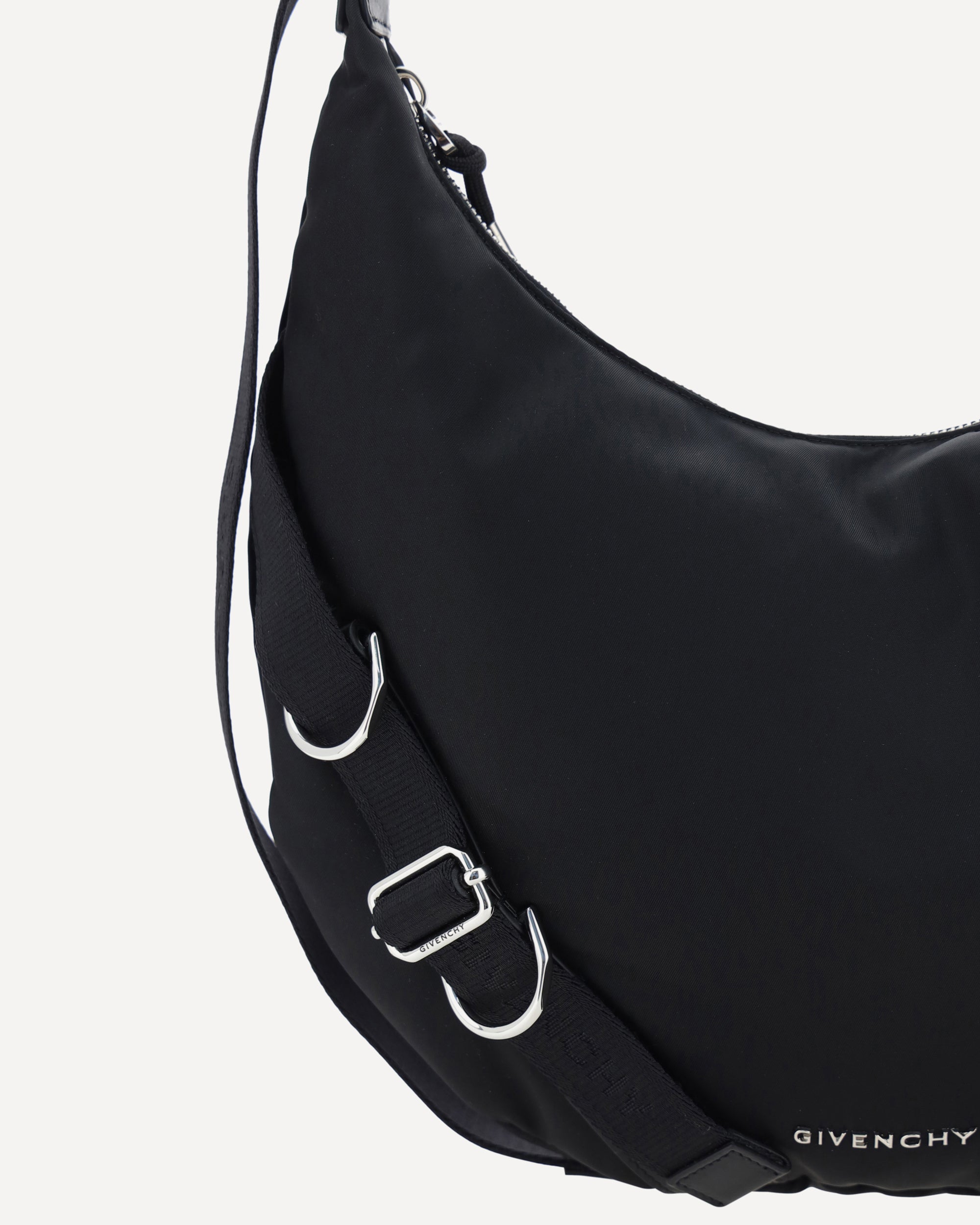 Nylon Voyou Shoulder Bag by Givenchy, flat shoulder strap giftable by contrasting metal buckles, top zipper closure, leather strap detail applied to front panel, soft design, iconic contrasting brand monogram on front, interior slit pocket, single interior compartment.