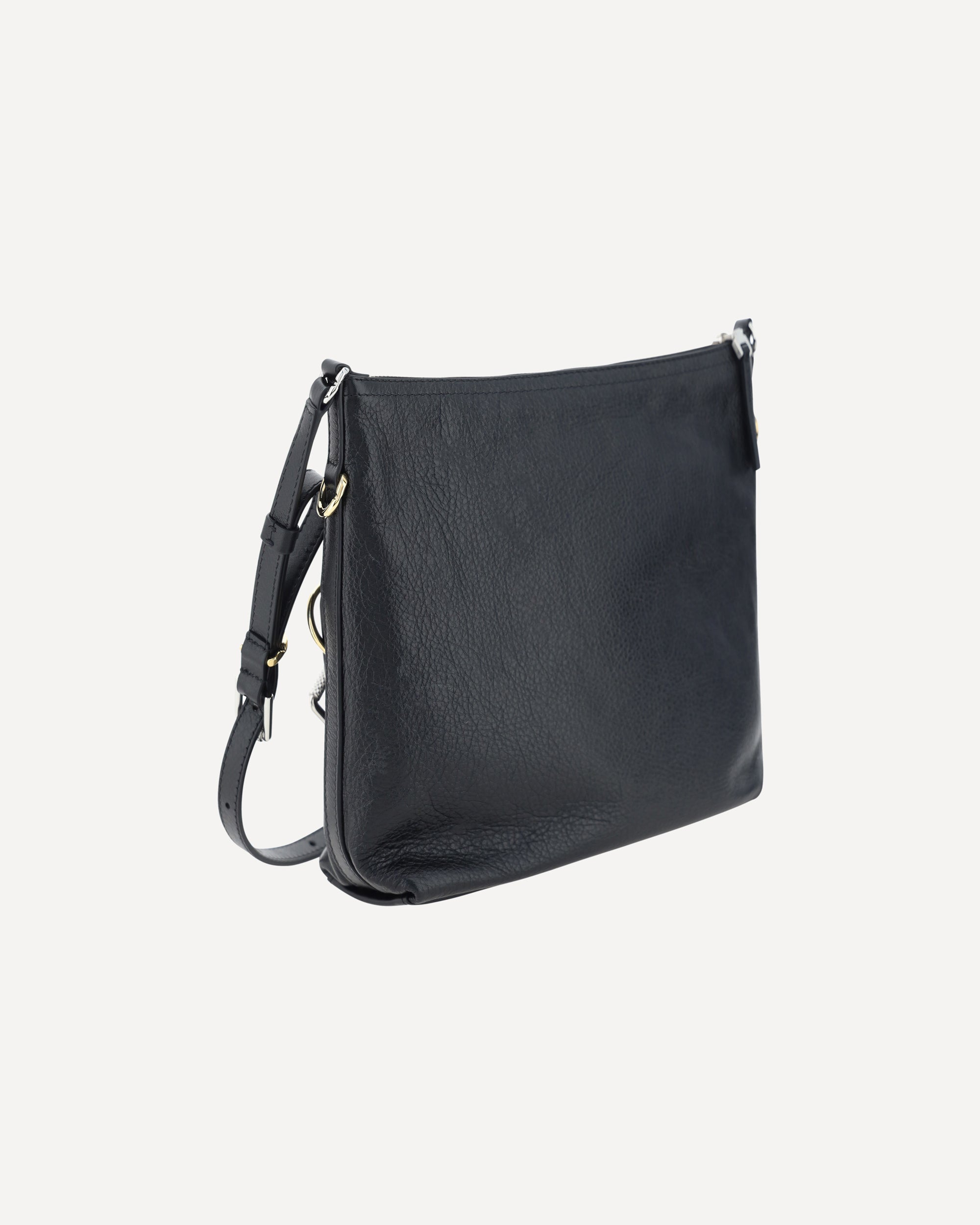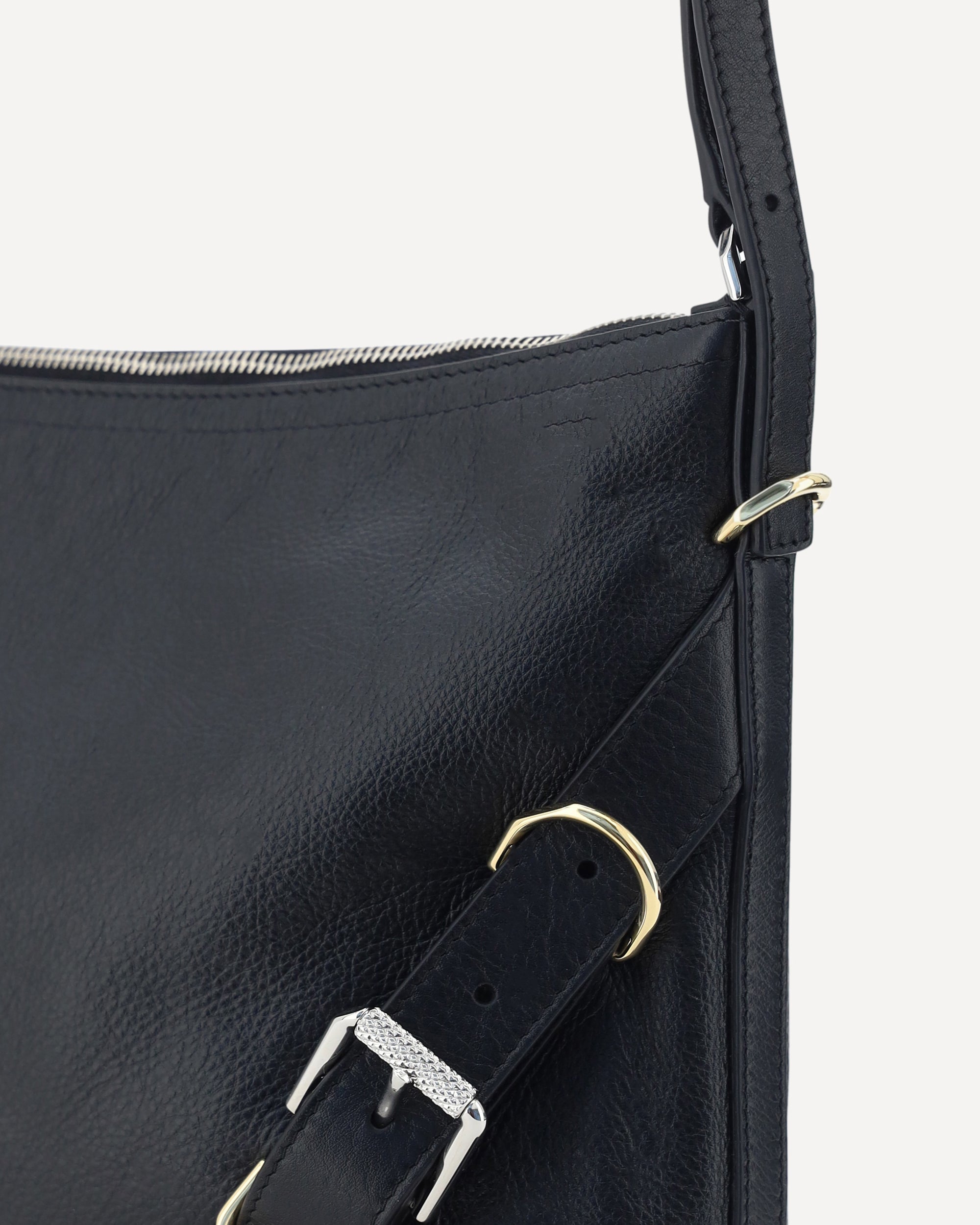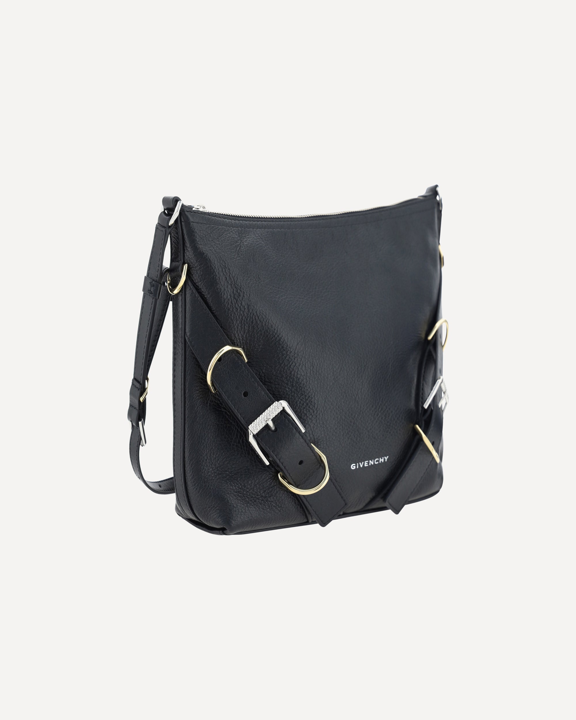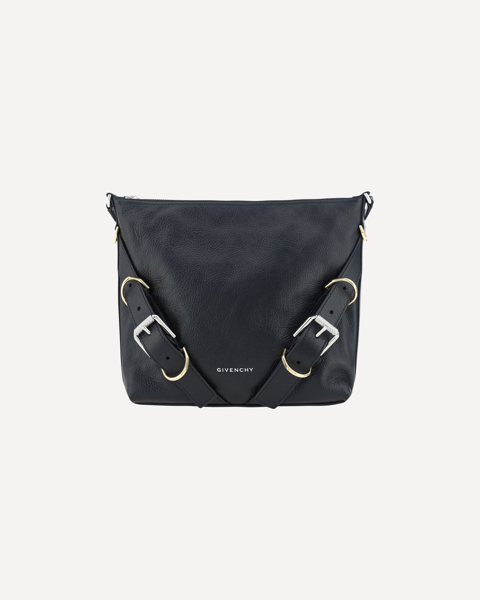 Calfskin Voyou Small Shoulder Bag by Givenchy, flat shoulder strap giftable by contrasting metal buckles, top zipper closure, leather strap detail applied to front panel, soft design, iconic brand monogram printed in contrasting press-stamping on front, interior slit pocket, single interior compartment.