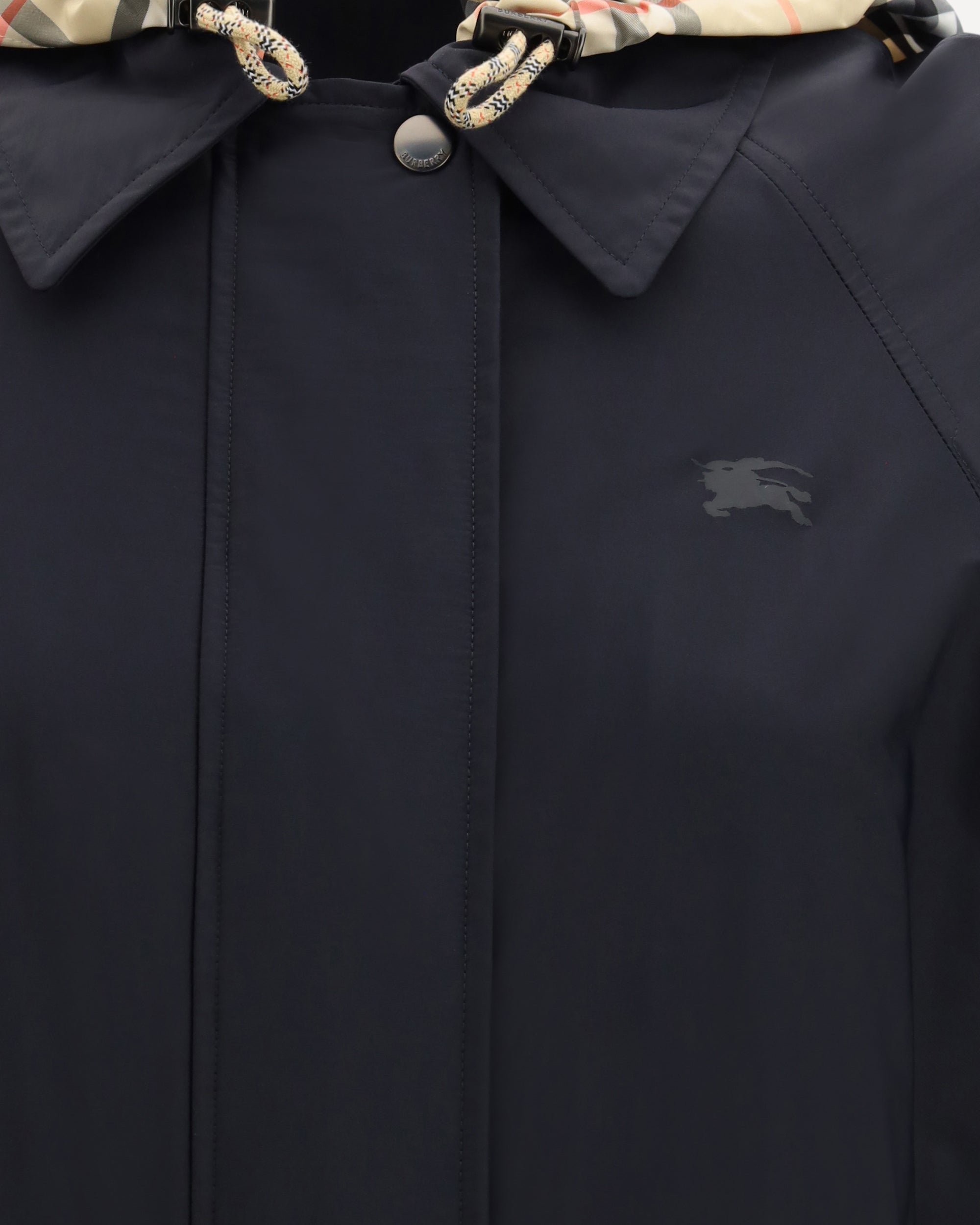 The Newbury Parka in stretch nylon twill by Burberry delivers a contemporary functional aesthetic through refined technical construction. A concealed front closure with zip and snap buttons creates a clean silhouette, while the detachable hood with adjustable drawstring enhances versatility. Long raglan sleeves with adjustable cuff tabs ensure comfort and ease of movement, complemented by an internal drawstring at the waist to shape the fit. Flap side pockets with snap buttons complete the practical design, while the tone-on-tone Equestrian Knight Design print on the chest adds a subtle and iconic signature.