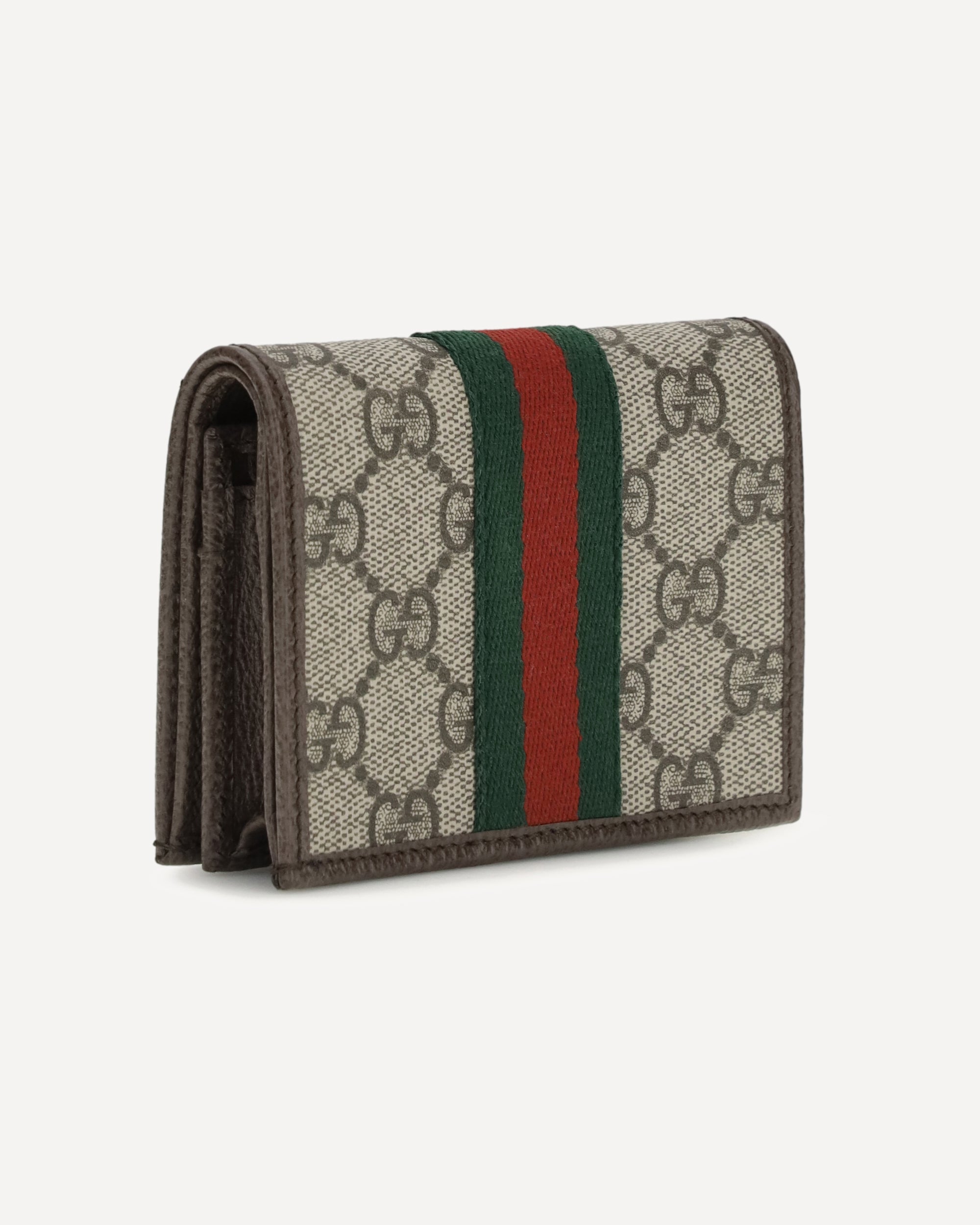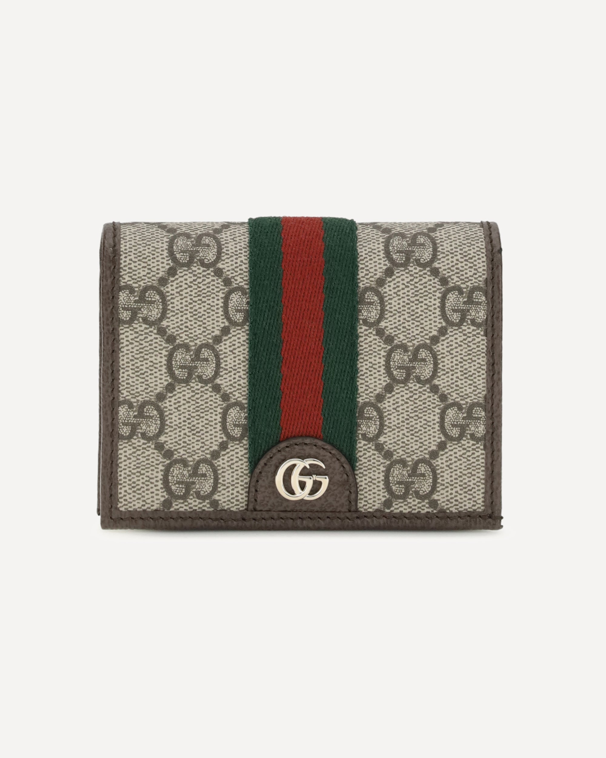 The Ophidia small Wallet by Gucci is crafted from soft beige and dark brown GG Supreme leather with brown leather trim and light gold-tone hardware. The brown taffeta lining, Double G detail, and Web stripe complete the iconic design. Inside, it features five card slots, one open pocket, one zip pocket, and one bill compartment, while the snap closure ensures practicality and security.