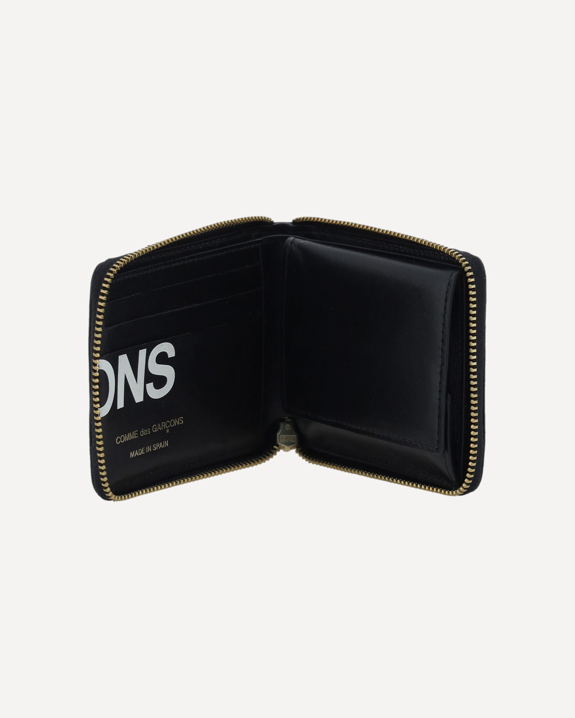 The Comme des Garçons Wallet leather Wallet features a zip-around closure for added security and convenience. The contrasting logo is printed on the front and back, adding a graphic and recognizable touch. Inside, a bill compartment, card slots and snap-button coin pocket provide optimal organization. The gold-tone logo engraved on the inside left side completes the design with an elegant and refined detail.