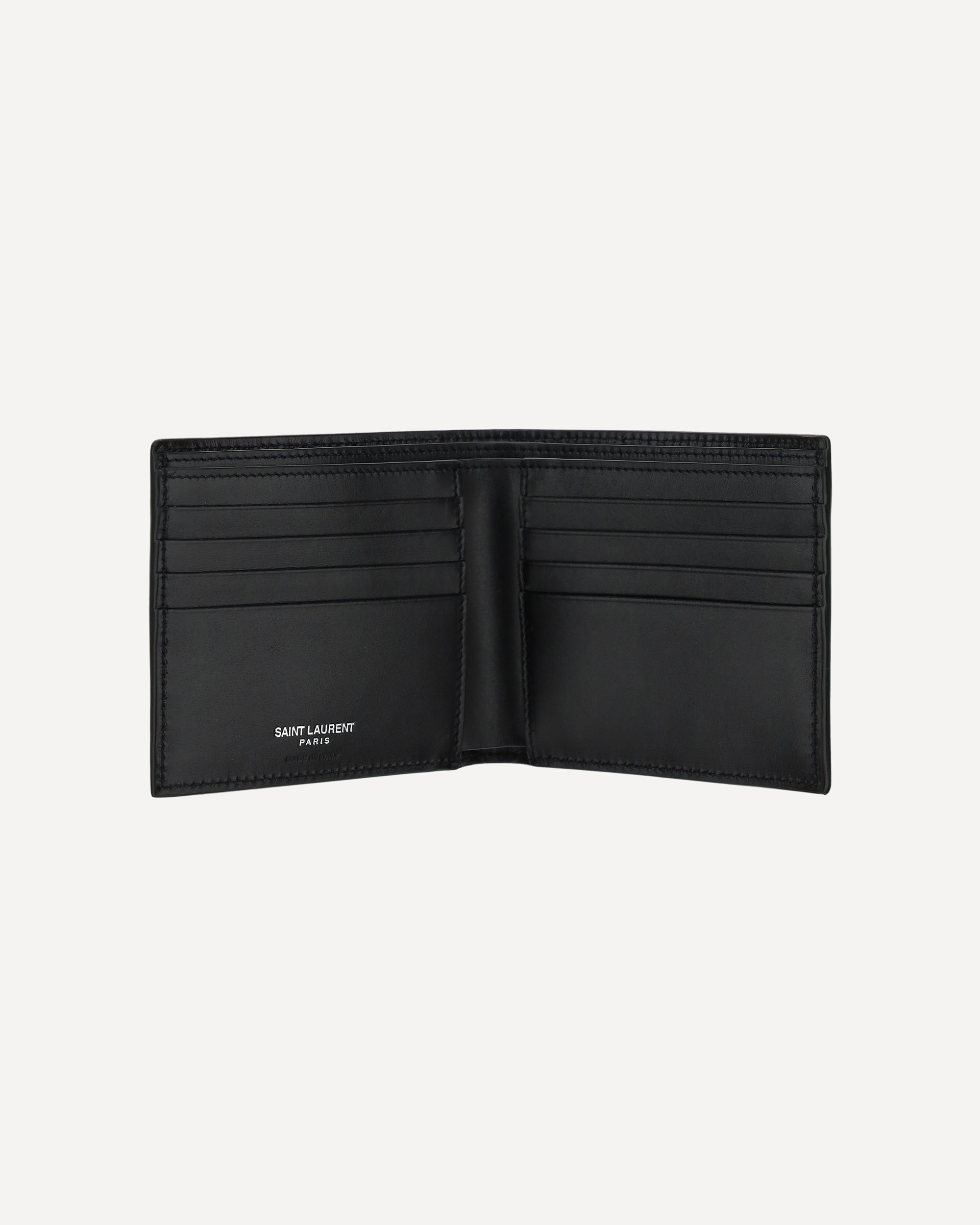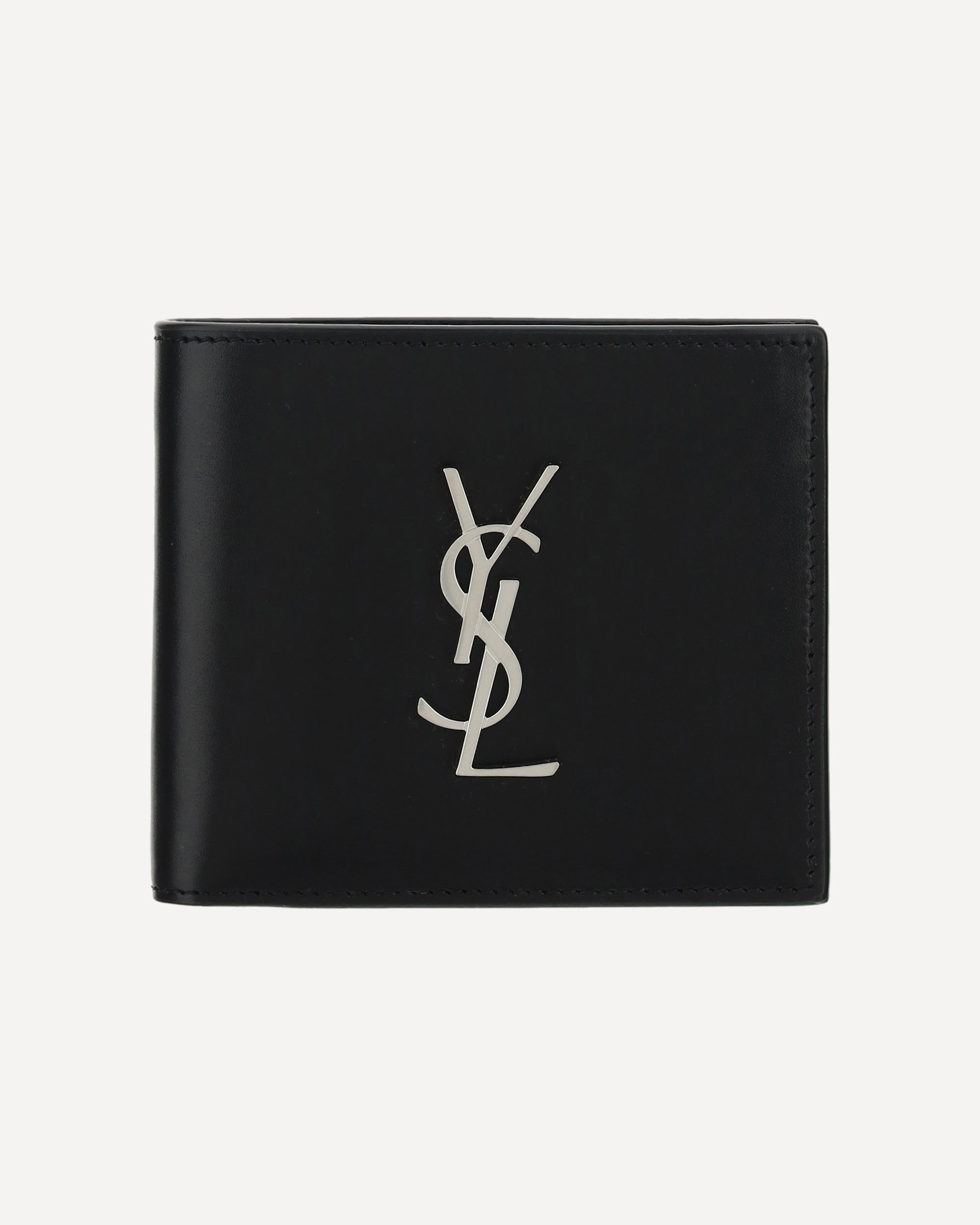 Calfskin Wallet by Saint Laurent, billfold design, contrasting embossed iconic brand monogram plaque on the front, internal card slots, banknote compartment.