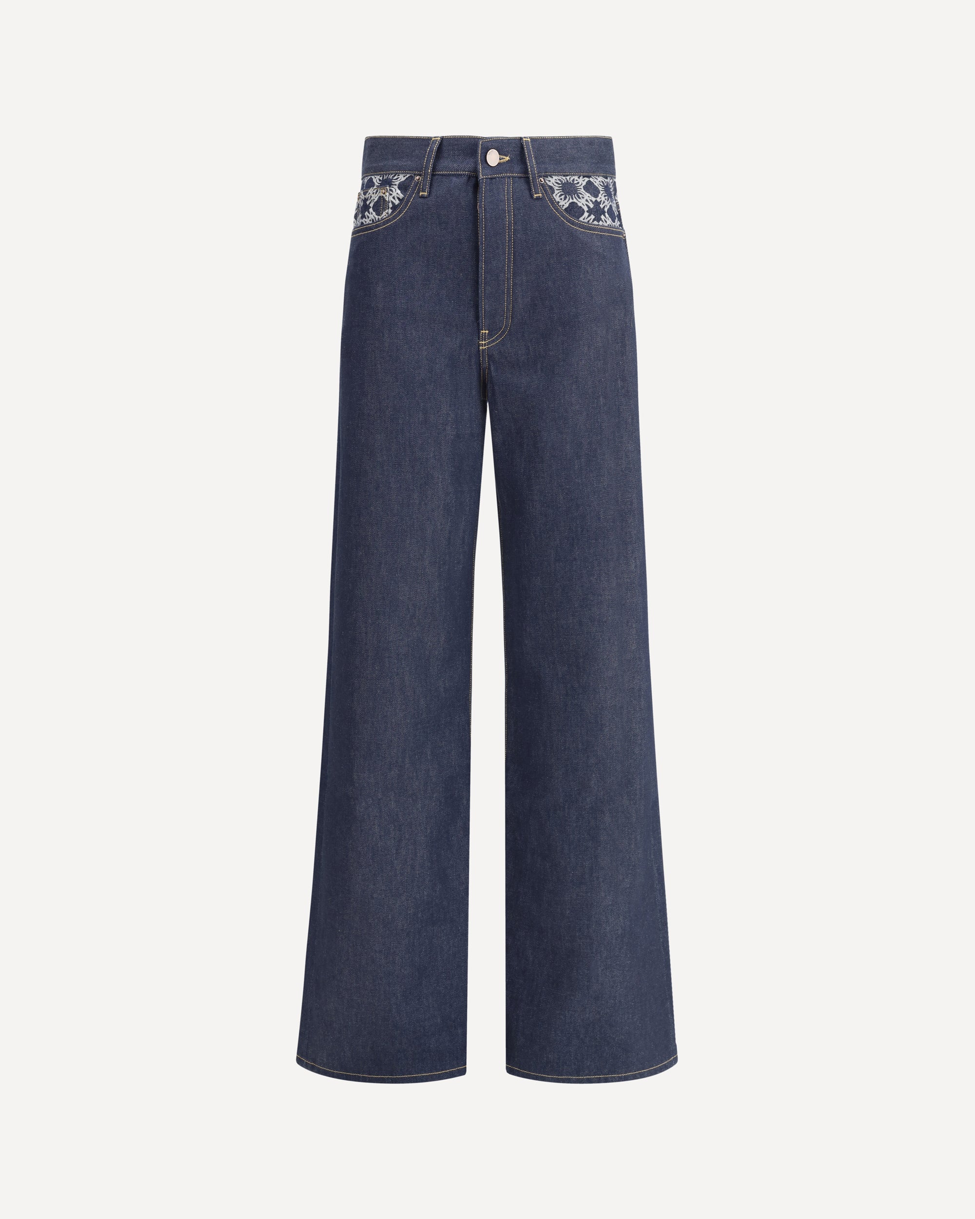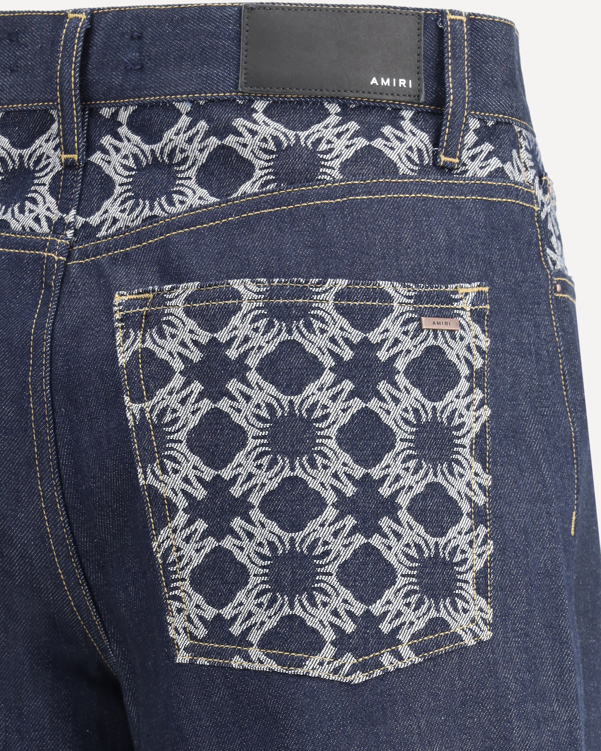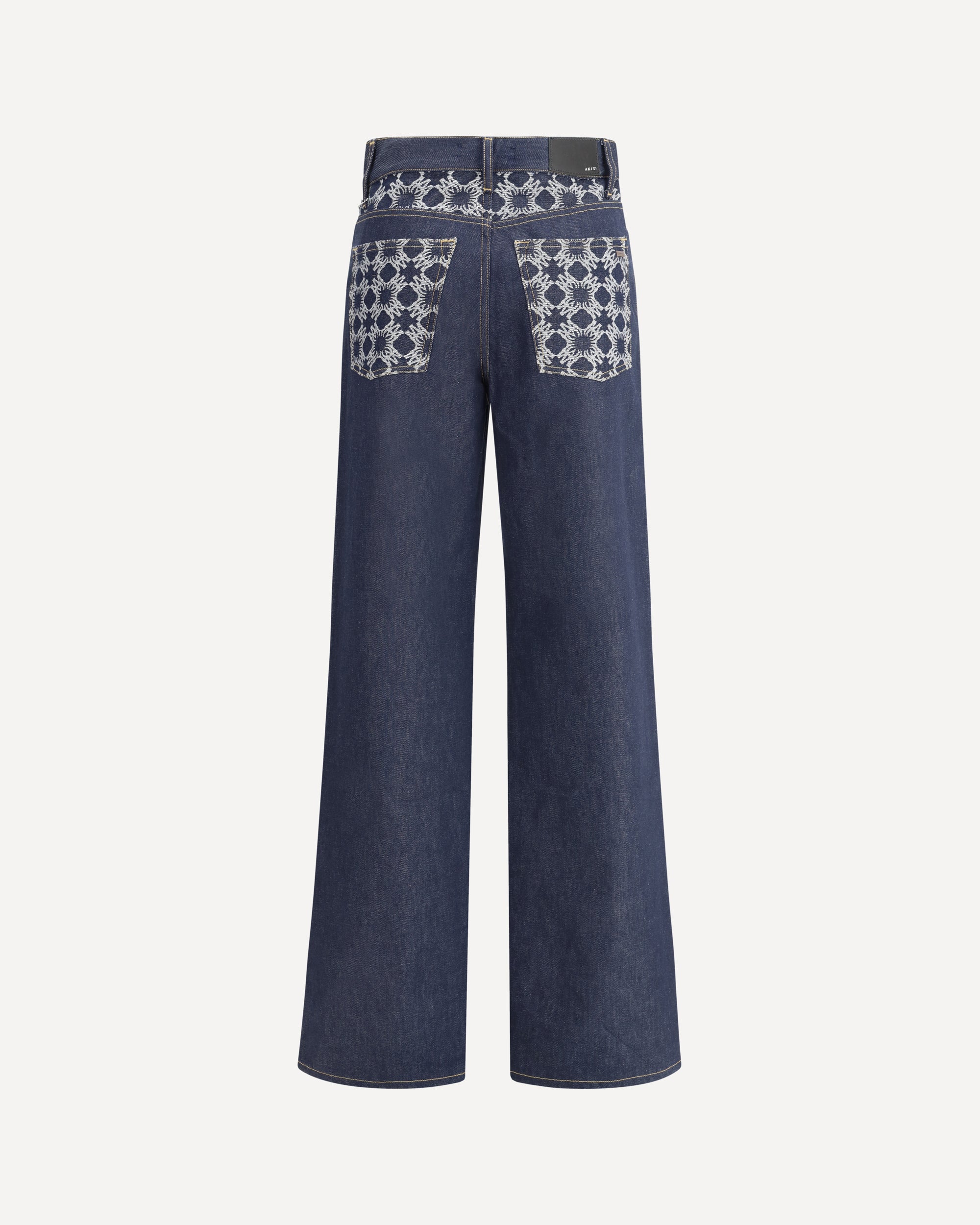 Amiri's wide leg Jeans are a five-pocket style with front zipper and button closure. They feature belt loops on the waistband, offering a customizable fit. The brand's iconic logo is embossed on the front and back pockets, adding a distinctive and refined detail. The palazzo cut gives a loose, modern look, balancing comfort and style in a sleek, contemporary design.