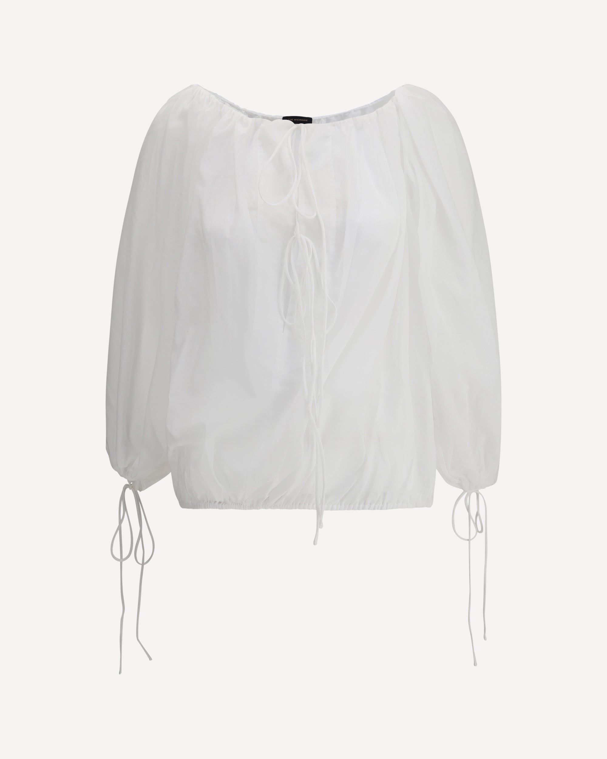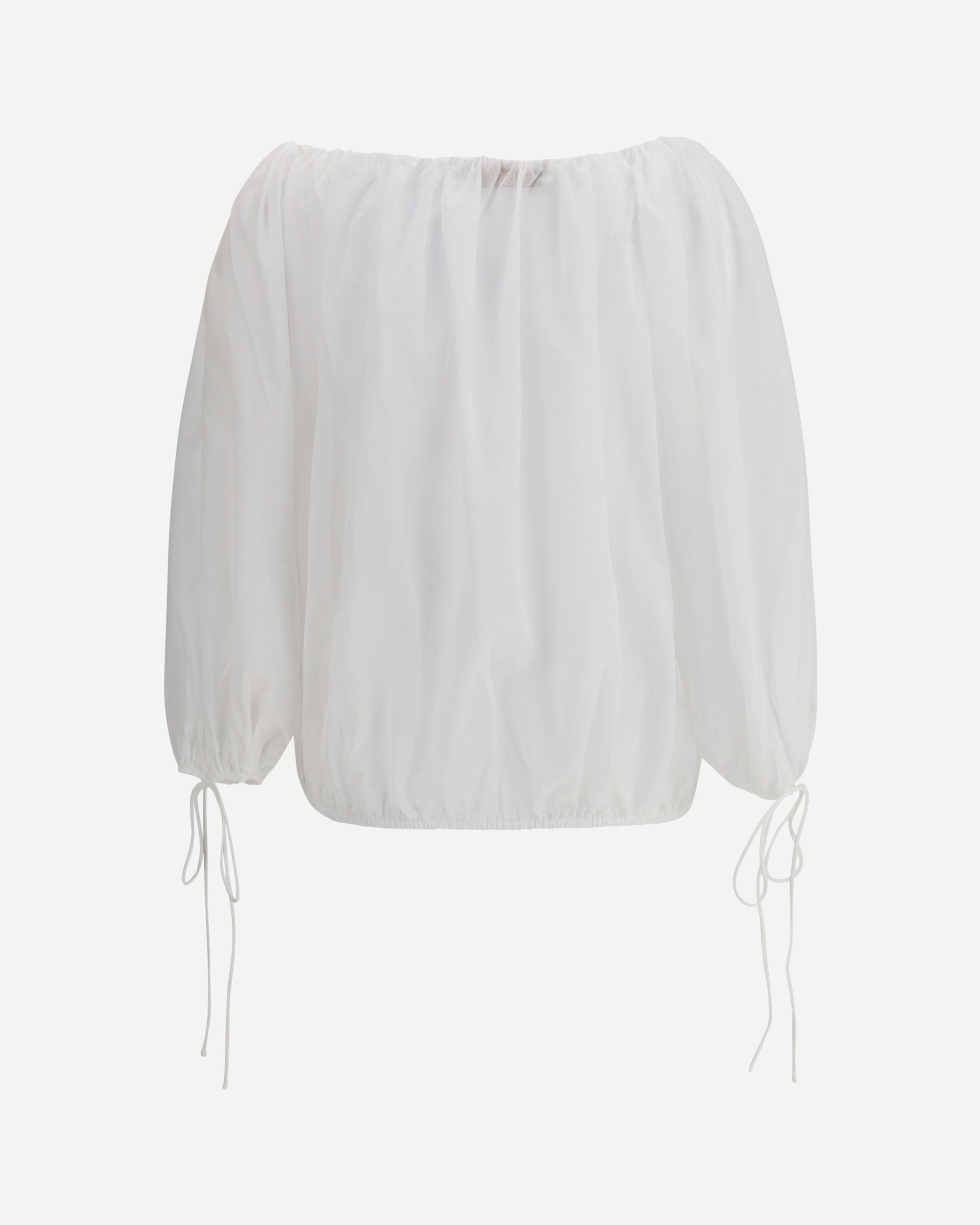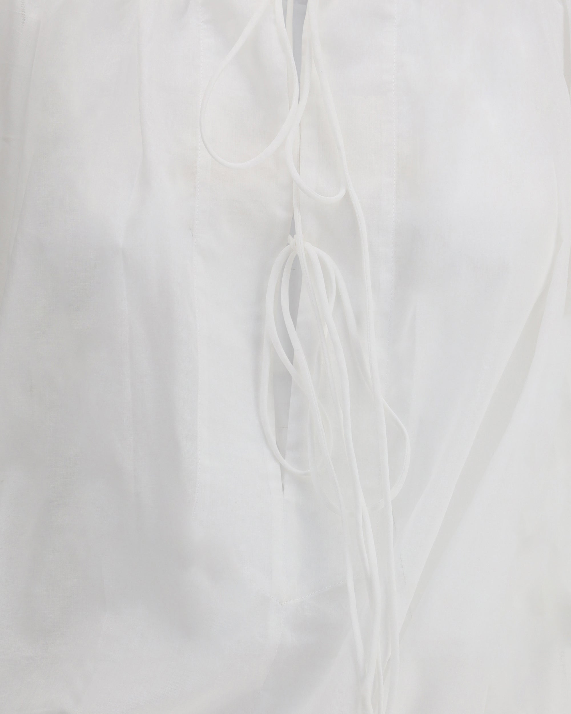 The Wilma Blouse by The Andamane is a feminine and versatile garment perfect for the warm season. Made of lightweight cotton, it features wide balloon sleeves with ribbon ties for a romantic touch, an elasticized hemline and an adjustable neckline at the front with double ribbon ties. The loose fit ensures comfort and style, ideal for creating casual yet curated looks.