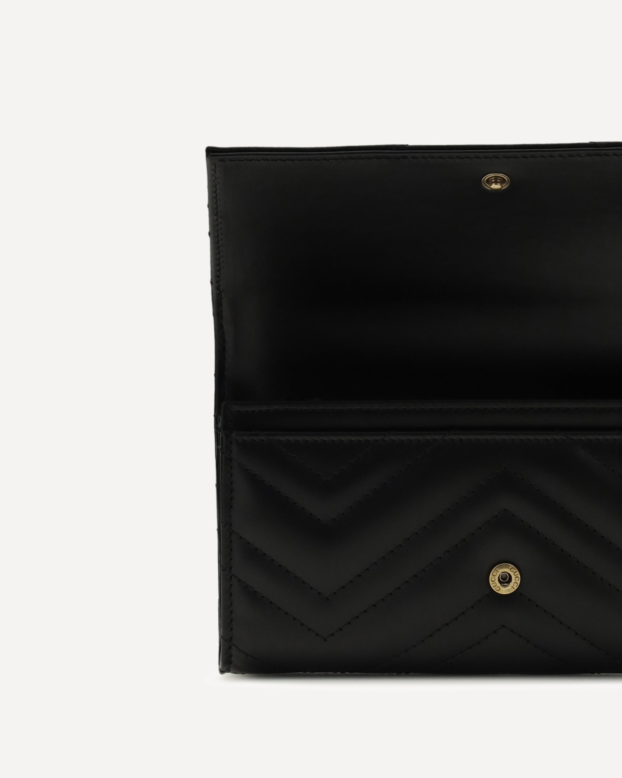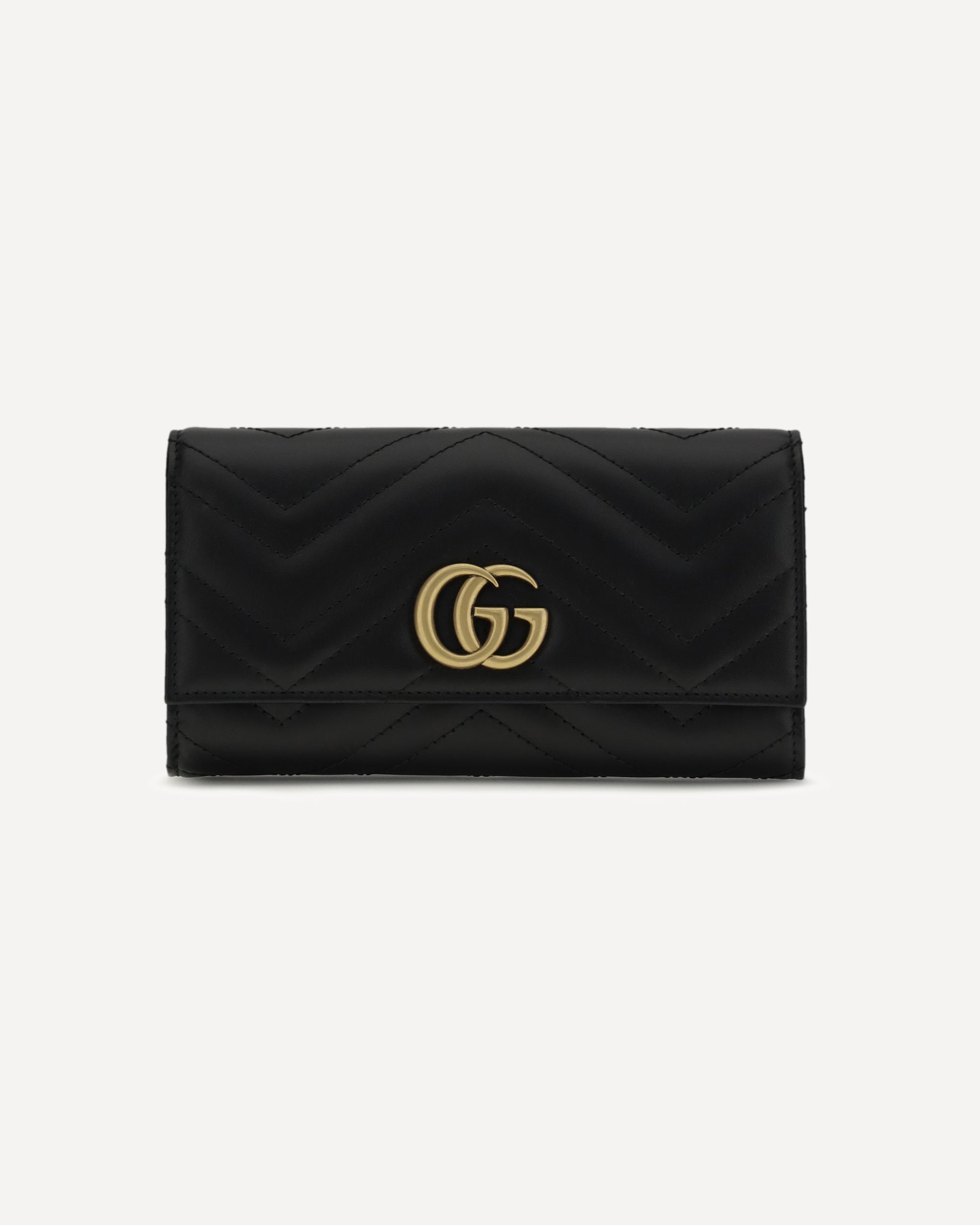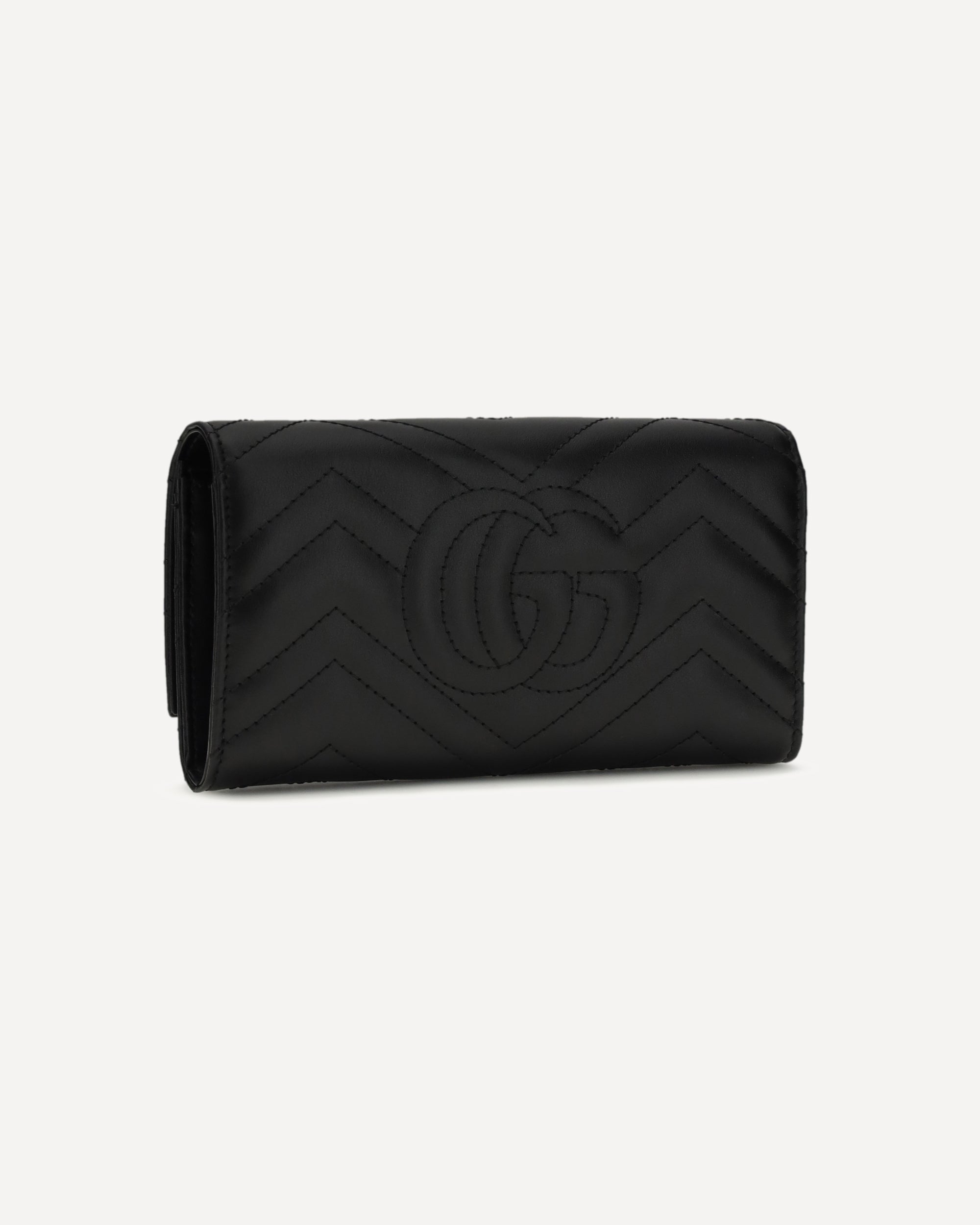 The GG Wallet in matelassé leather by Gucci is an elegant and practical accessory, featuring a refined matelassé texture and a flap with button closure. The gold GG logo plaque adds a touch of luxury, while the card slots, zippered coin pocket, and bill compartment inside offer perfect organization. An ideal blend of style and functionality, perfect for those looking for an iconic and sophisticated wallet.