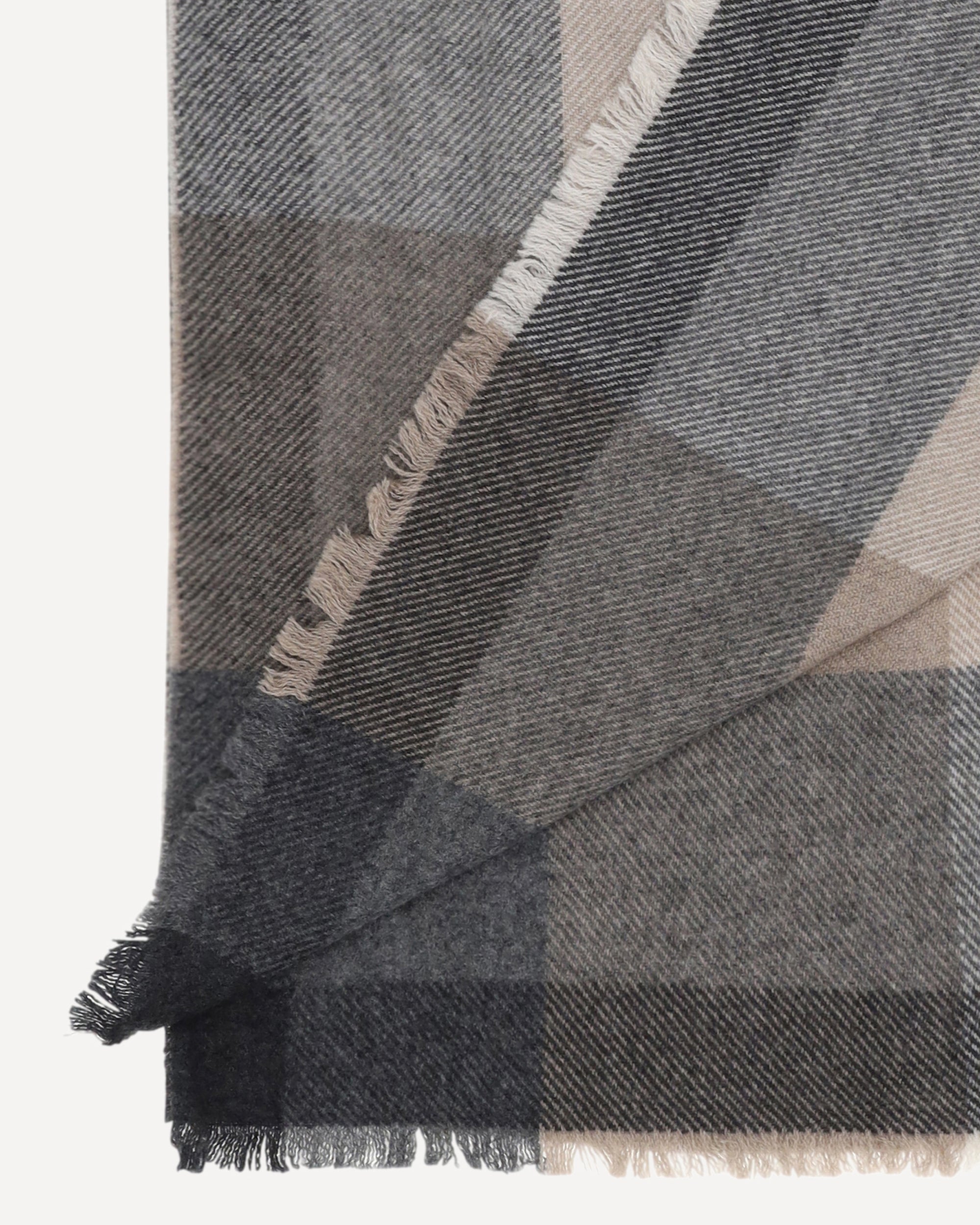 Brunello Cucinelli's Wool and Cashmere Scarf is a refined accessory perfect for adding a touch of elegance to winter looks. Made from a fine blend of wool and cashmere, it is embellished with a classic check pattern that lends character and versatility. Frayed edges complete the design with a delicately casual detail, maintaining the understated and distinctive style typical of the Maison.