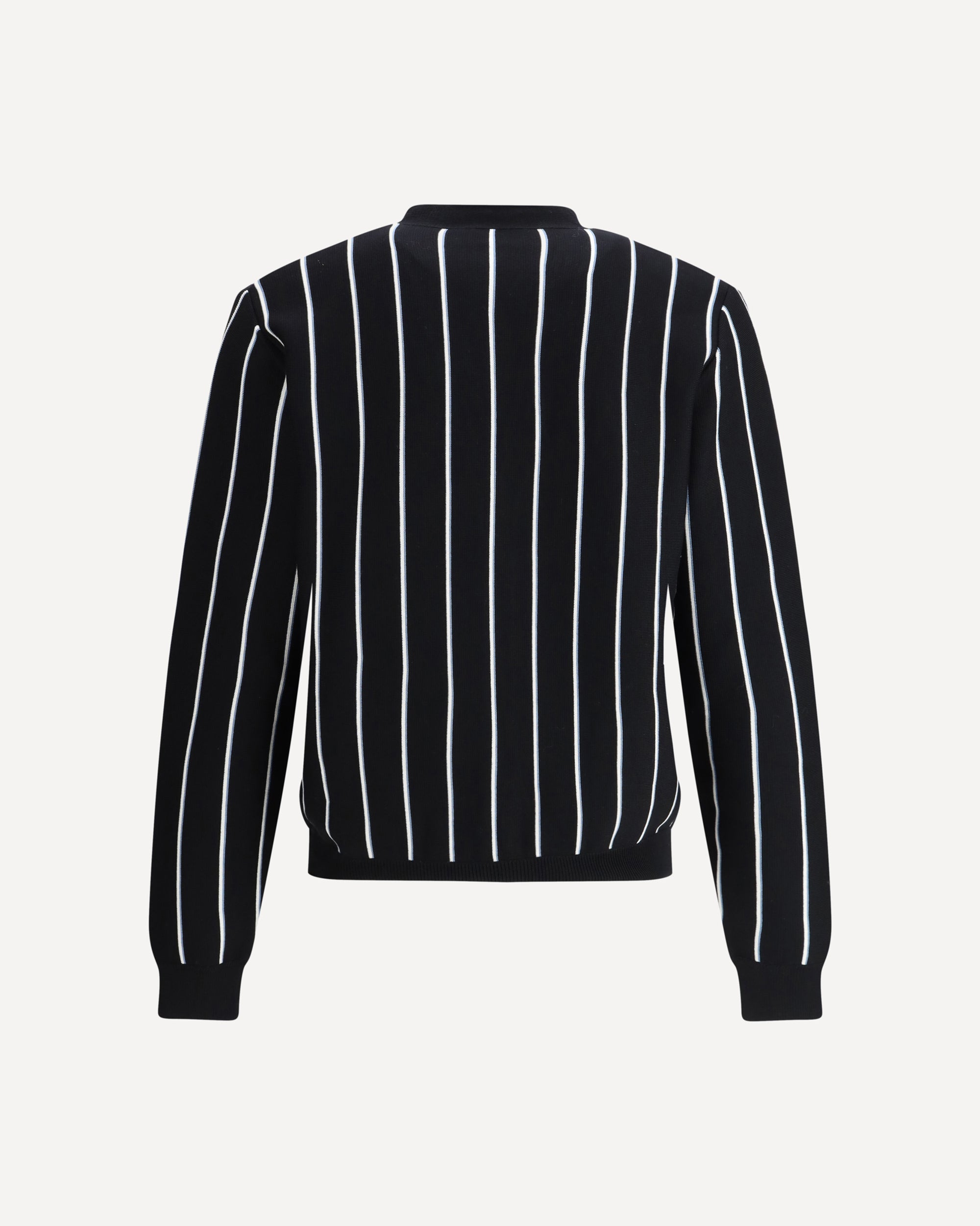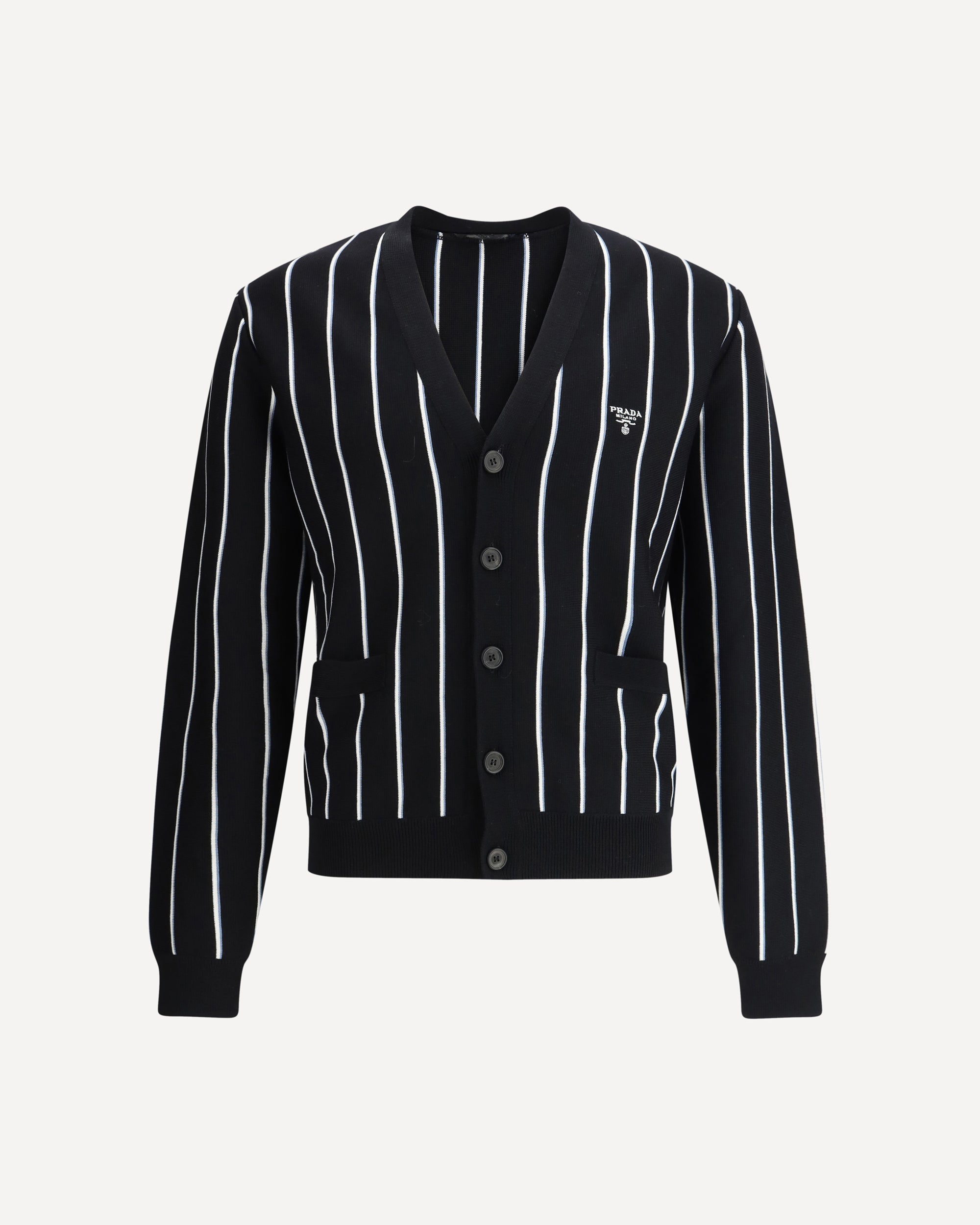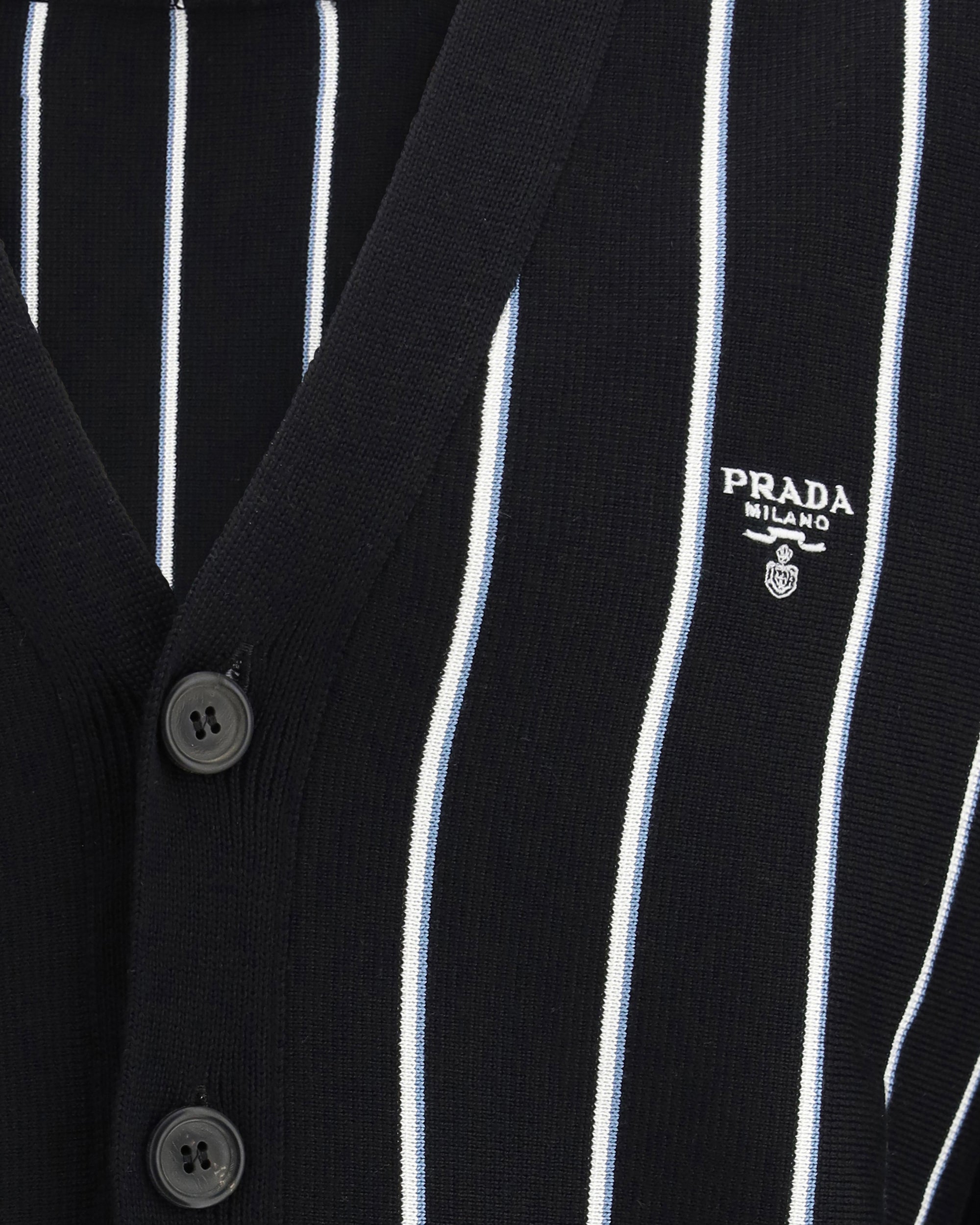 Prada's wool Cardigan is an elegant and refined piece with a front button closure and V-neck that define the design. Ribbed cuffs and hem ensure a comfortable fit, while the two front welt pockets with flaps offer practicality. The striped pattern adds a touch of style, and the brand's iconic jacquard logo on the front enhances its authenticity. A versatile and sophisticated garment ideal for casual-elegant looks.