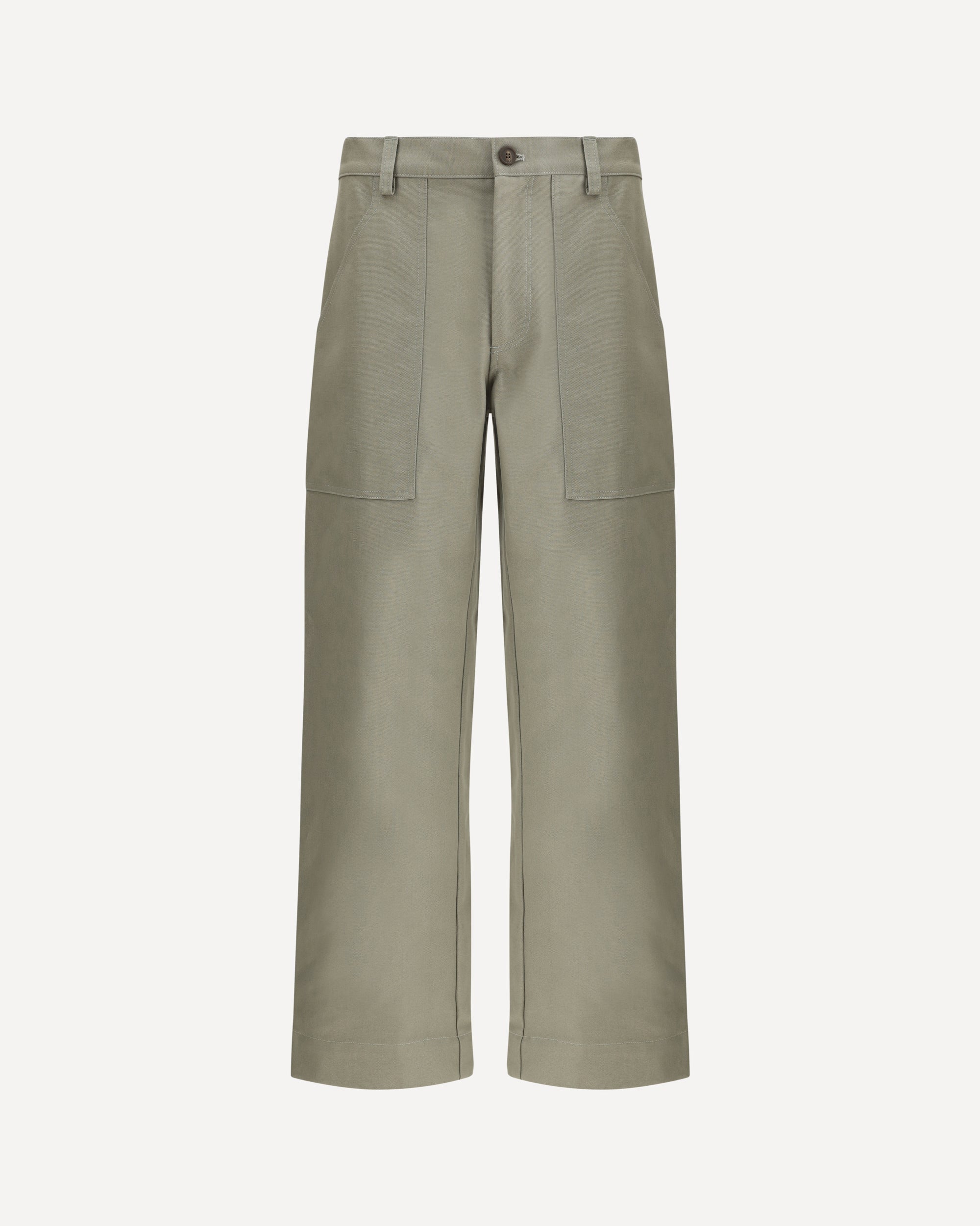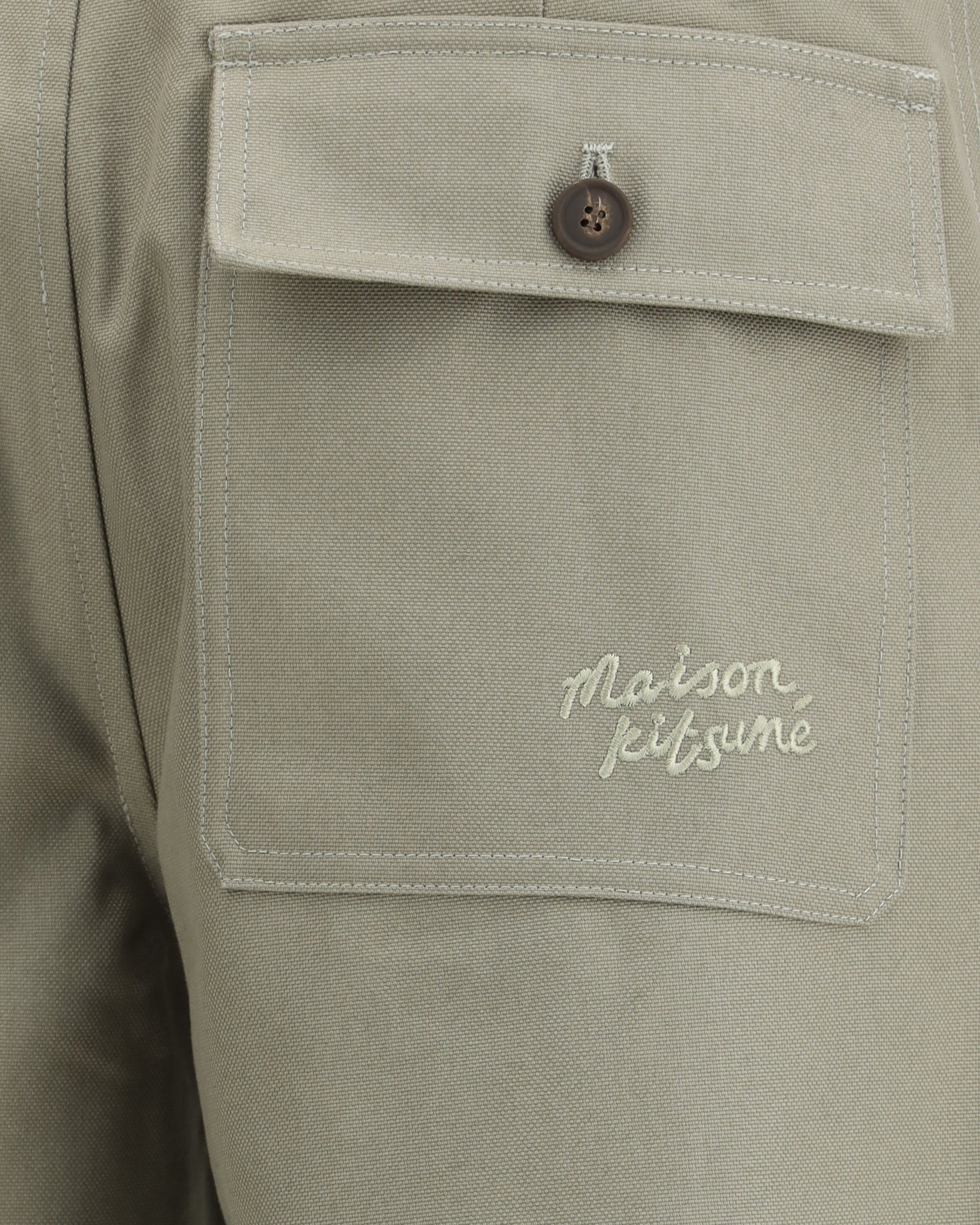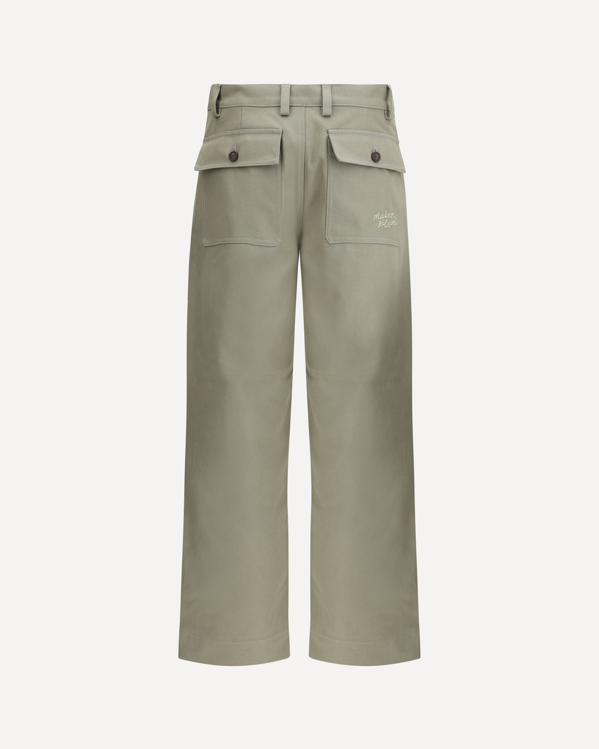 Cotton Workwear Pants by Maison Kitsuné, front zipper and button closure, two welt patch pockets on front, two welt flap patch pockets on back with iconic embroidered brand monogram detail, waistband loops, monochrome pattern, regular fit.