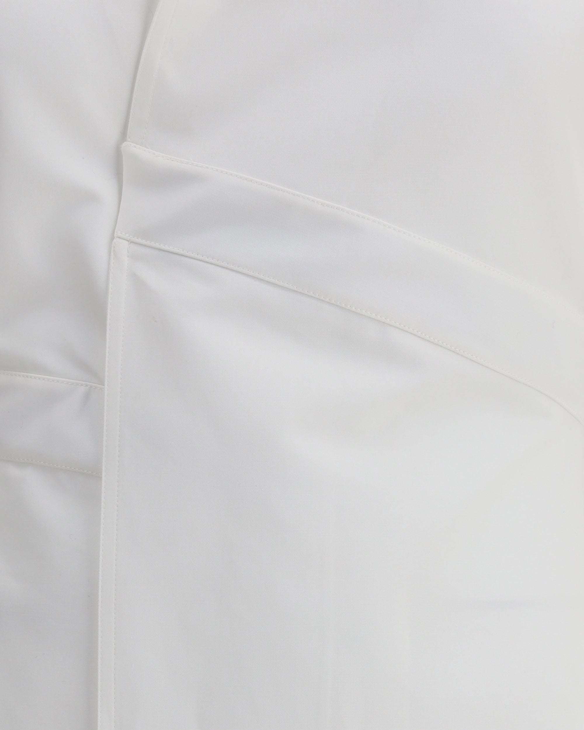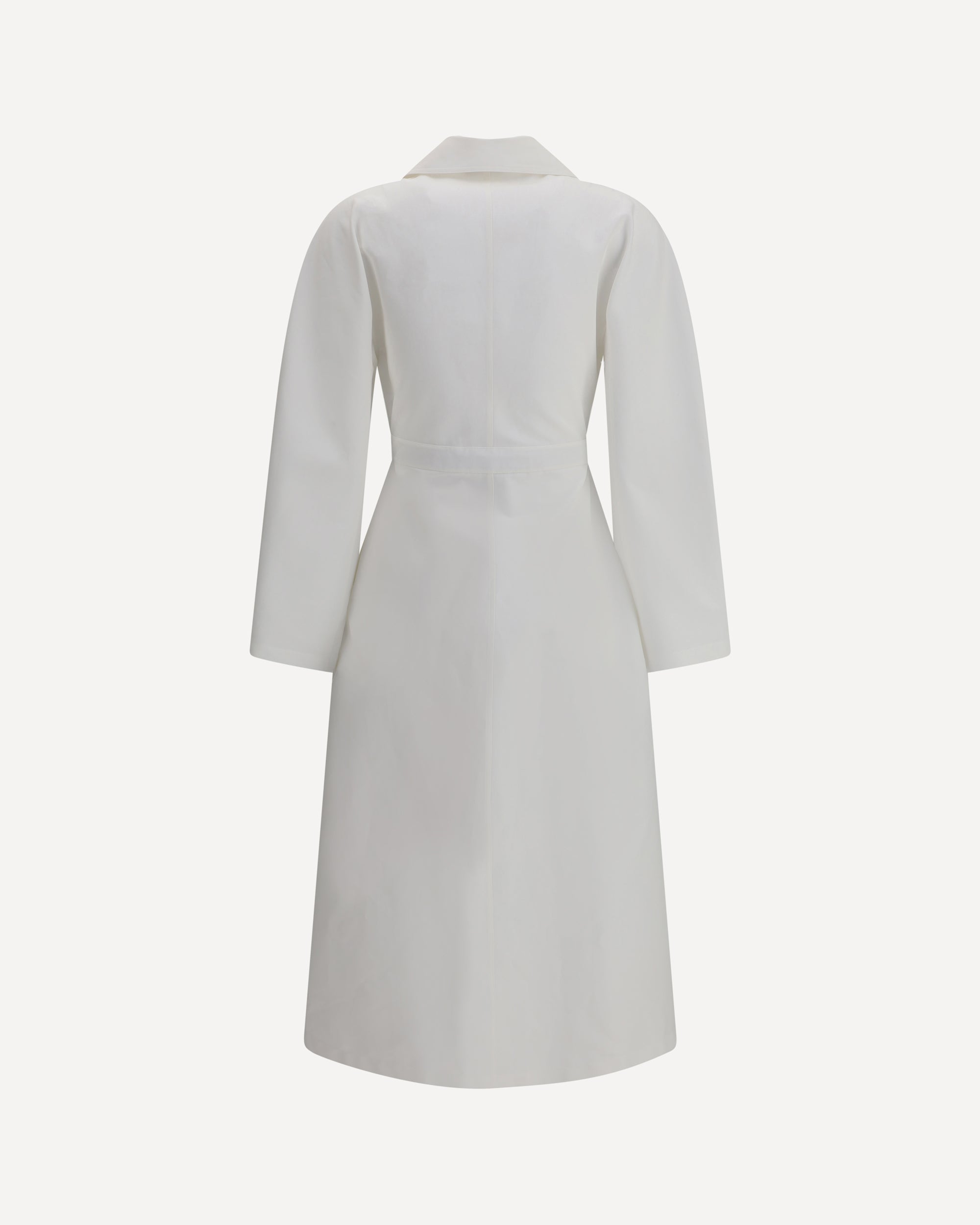 Cotton midi Dress by Alaïa has an elegant and structured design. It features a classic collar, long sleeves and a wrap-around closure with a metal plaque on the waist that enhances the silhouette. Two side welt pockets complete the look, practical and discreet. A sophisticated garment, perfect for sophisticated daytime looks or formal appointments.