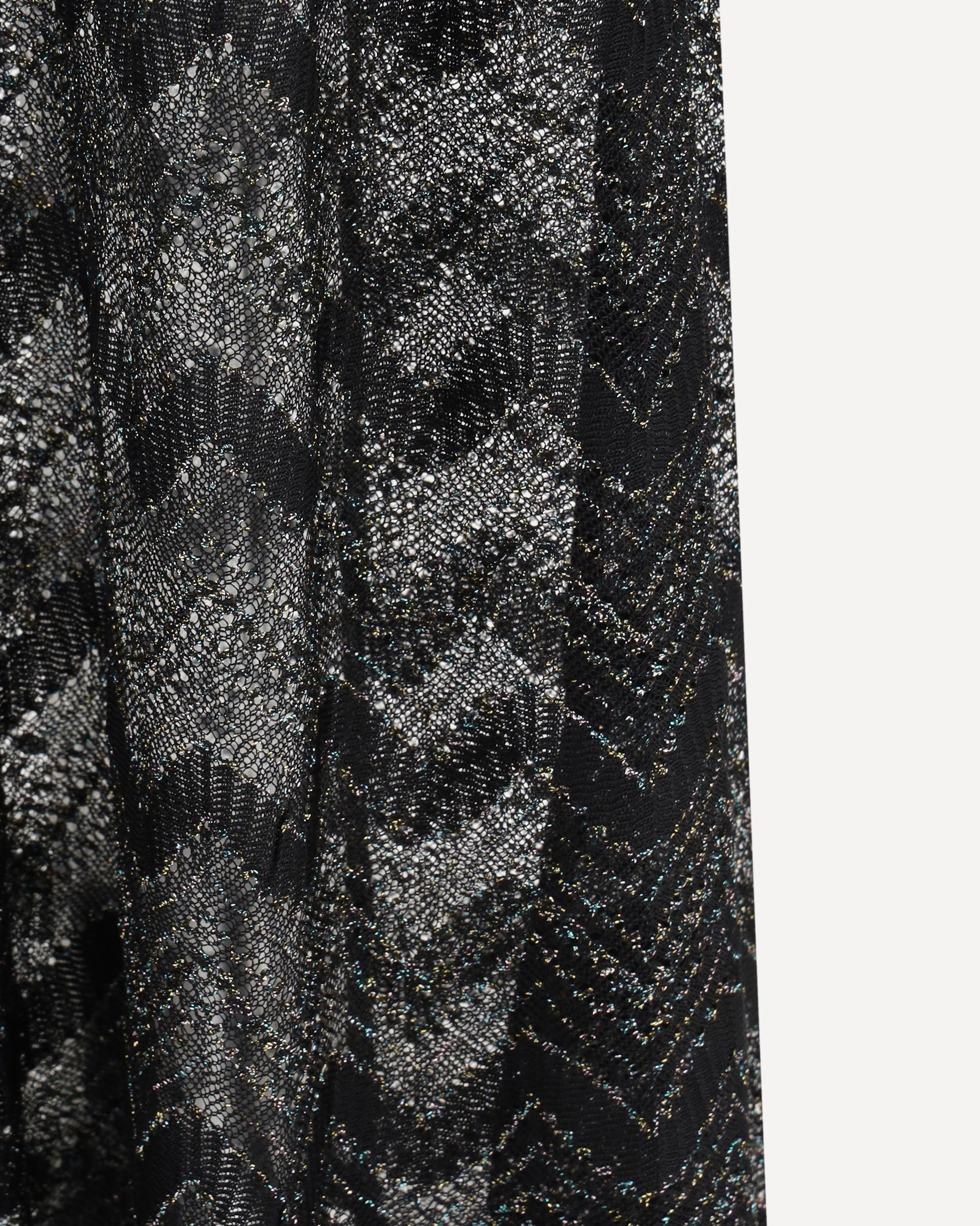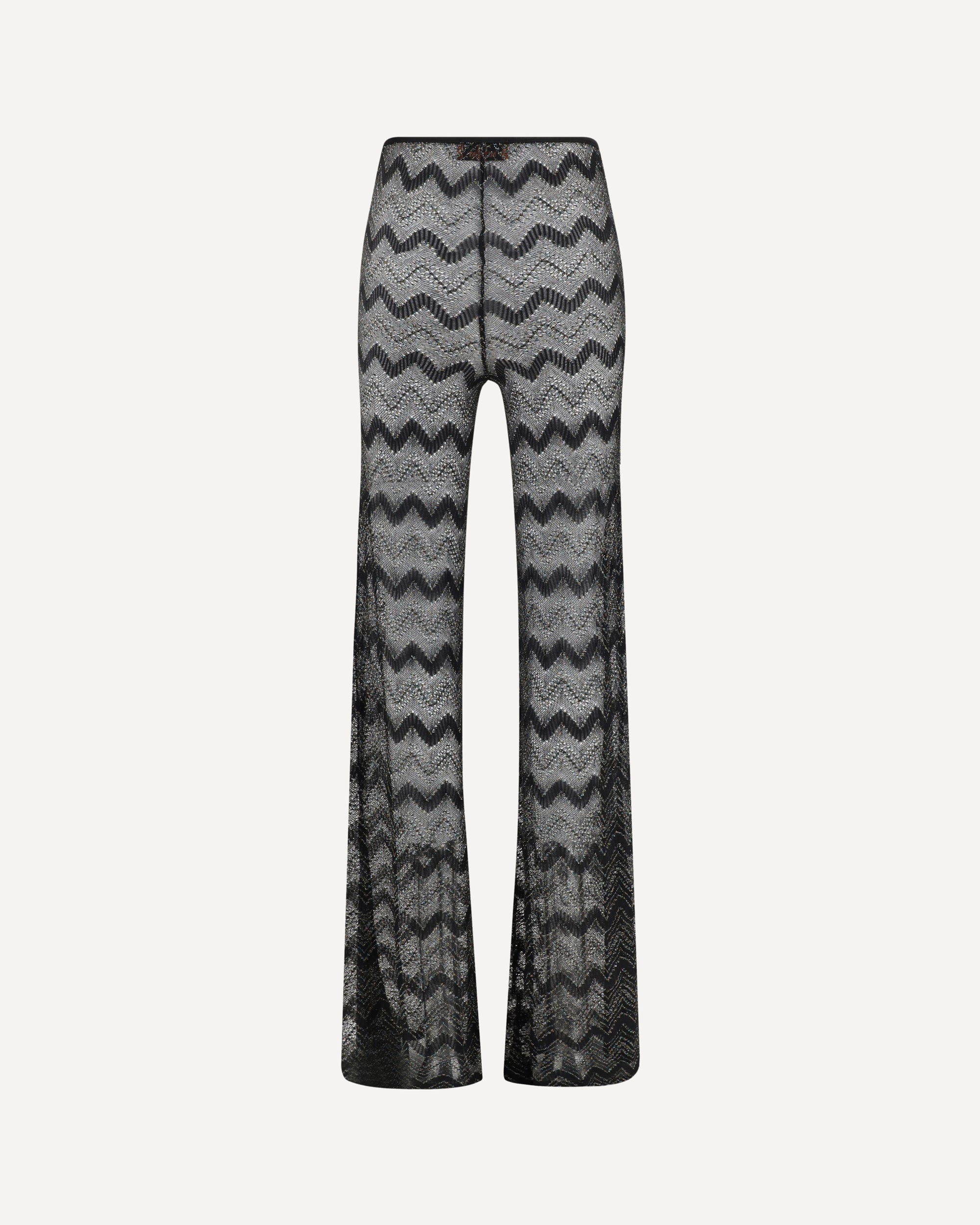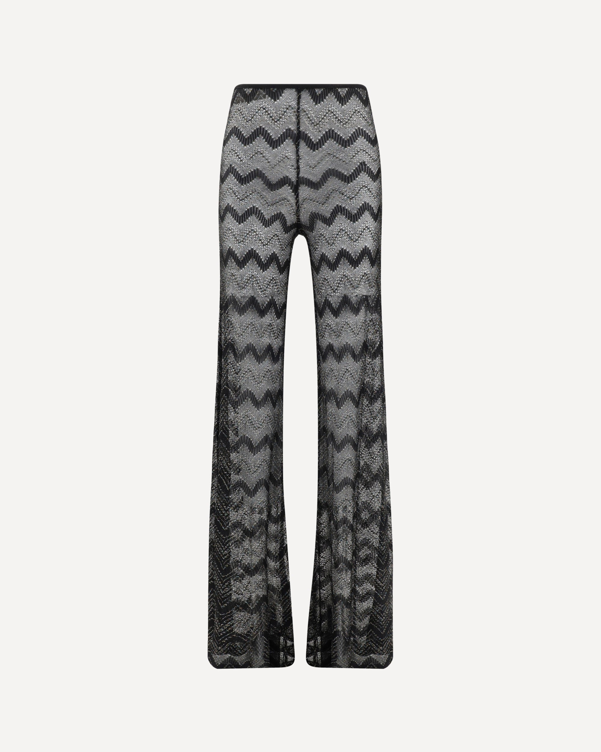 Missoni's zig zag-patterned Lamé Pants are a distinctive and bold piece, perfect for those who want a look full of personality. The elasticated waistband ensures comfort and adaptability, while the flared cut offers a sleek and dynamic silhouette. The semi-transparent lamé design gives a bright and refined effect, ideal for those who like to shine without sacrificing class. The zig zag pattern, iconic symbol of the Missoni brand, adds movement and originality, making these pants a central element of any outfit.